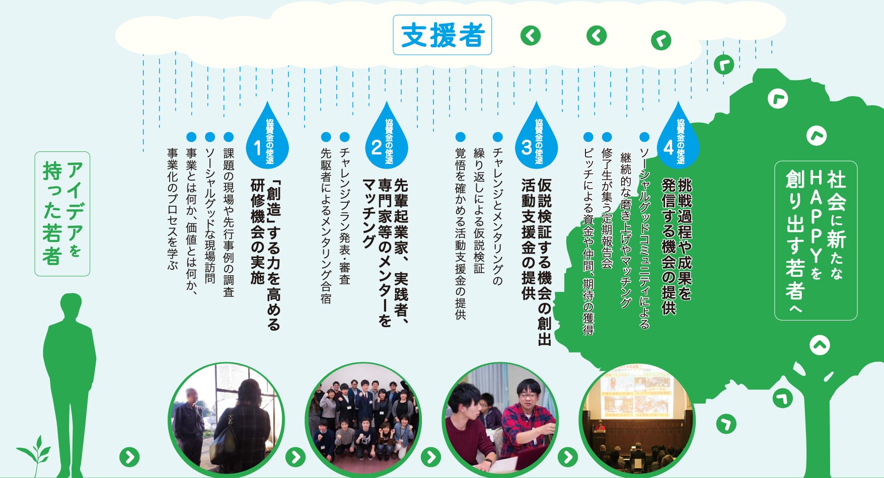 また、プログラムを卒業した卒業生たちは各自自走しつつ、iDEA→NEXTで挑戦をする後輩たちの支援者となり支えていく。