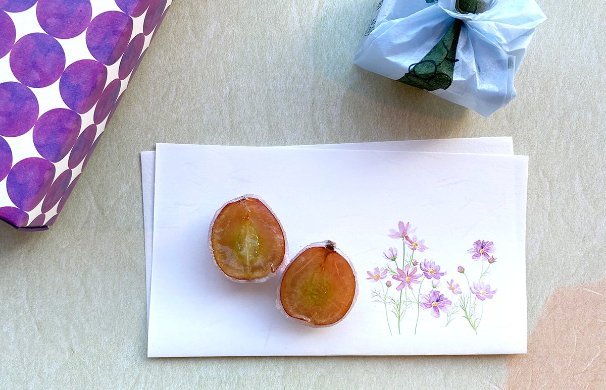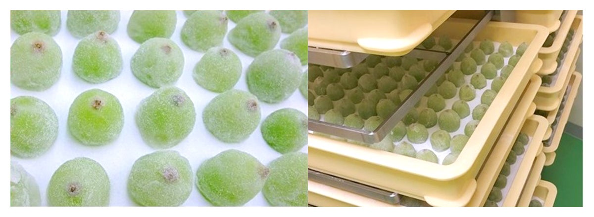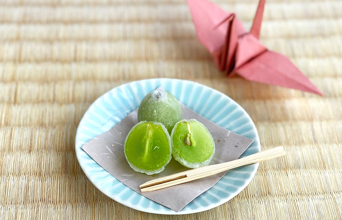 「ひとつぶのマスカット」は求肥を極力薄めに包むようにしており、フルーツを厚めのお餅で包む「大福」とはやや異なる、食感や味わいです。またひとつぶごとに形状が違うため、機械では薄くきれいに包むことが難しく、一貫して手包みにこだわっています。
