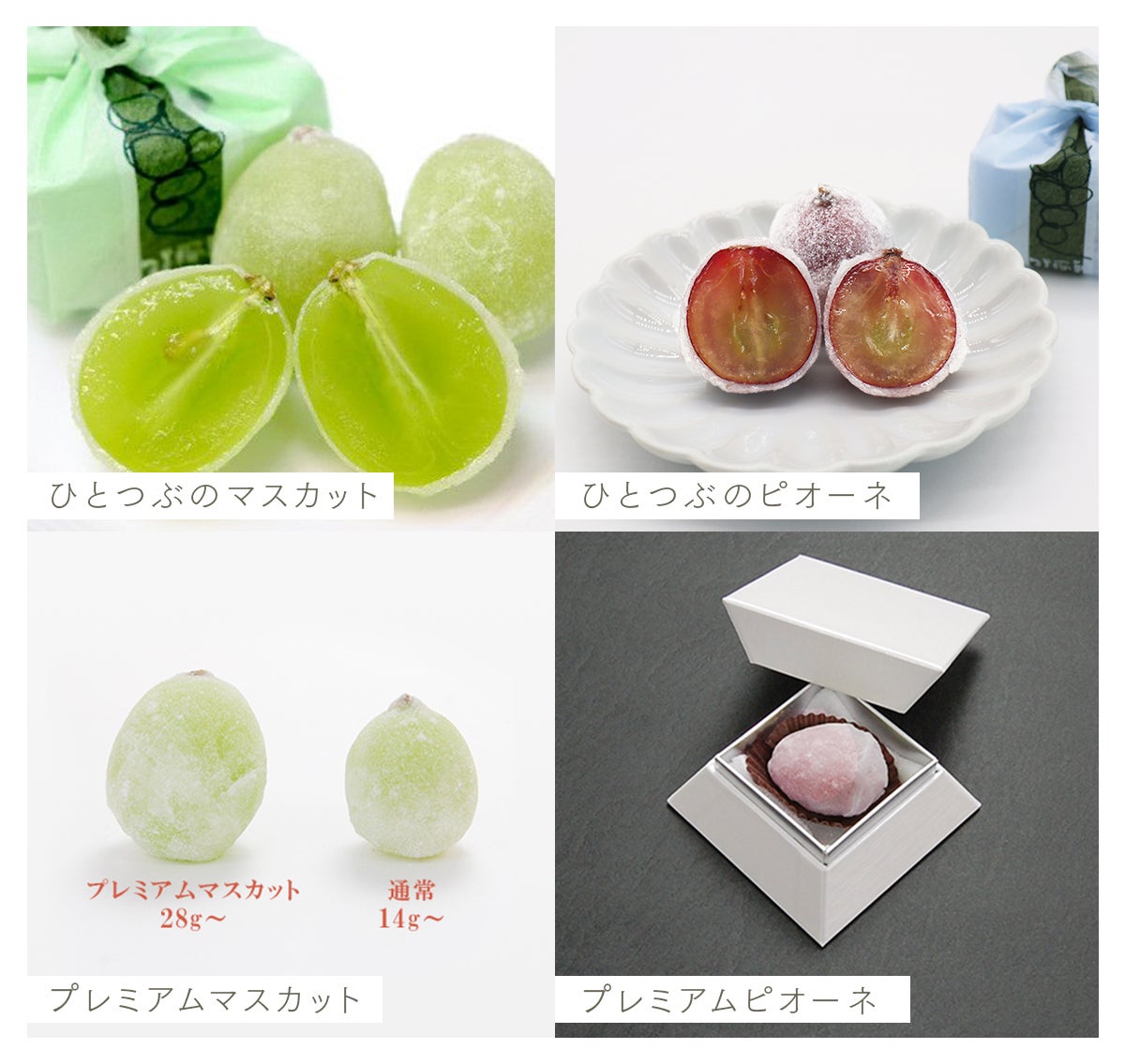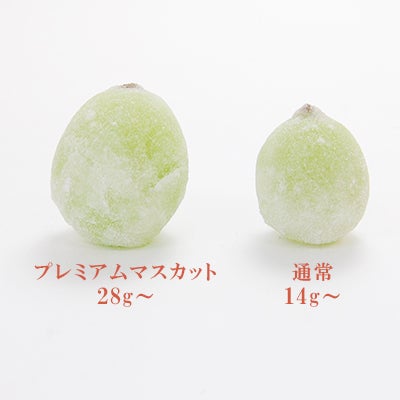 通常の「ひとつぶのマスカット(ピオーネ)」はぶどうの粒としては14グラム~くらいのものを使用しています。プレミアムマスカット(ピオーネ)は旬の時期に収穫されるマスカット・ピオーネの中で、通常の倍(28グラム)ほどの超大粒のものだけを厳選して使用します。