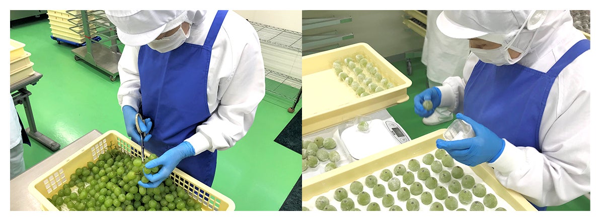 誕生から40年以上になりますが、新鮮なマスカットをひと粒ずつ手作業で包む製法は全く変わらず、今に引き継がれています。