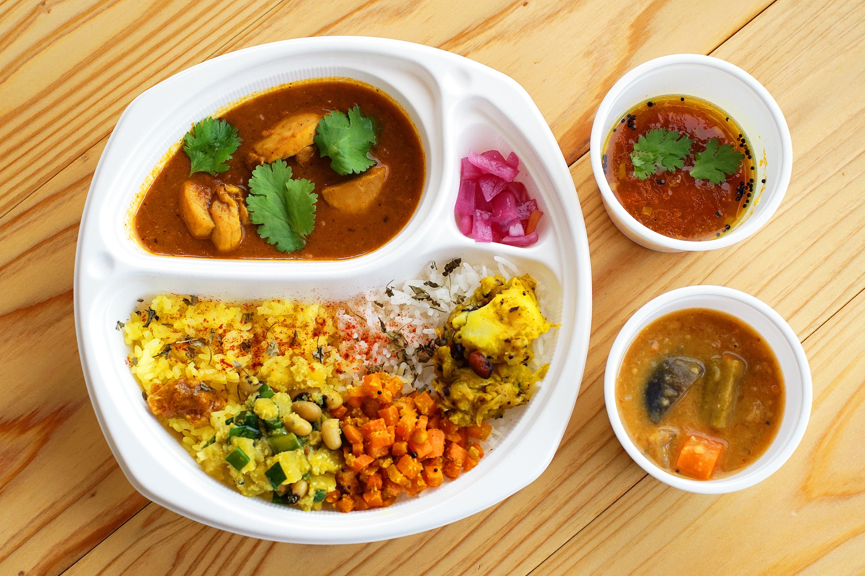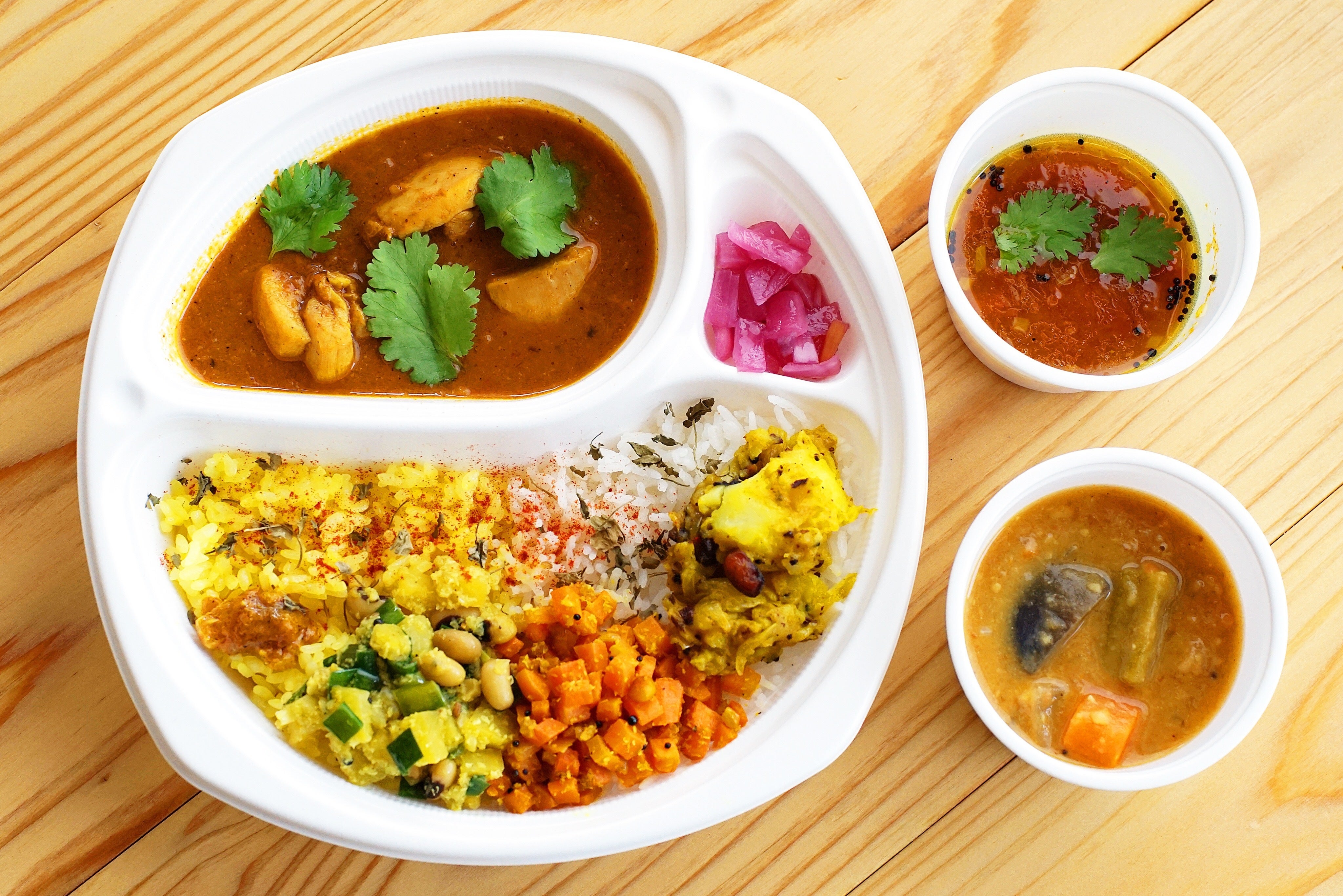 看板メニューのミールス3種テイクアウトのカレーも販売しています。自宅でも本格ミールスを楽しんで頂けるよう、お店で出している内容をそのままお弁当にしました。