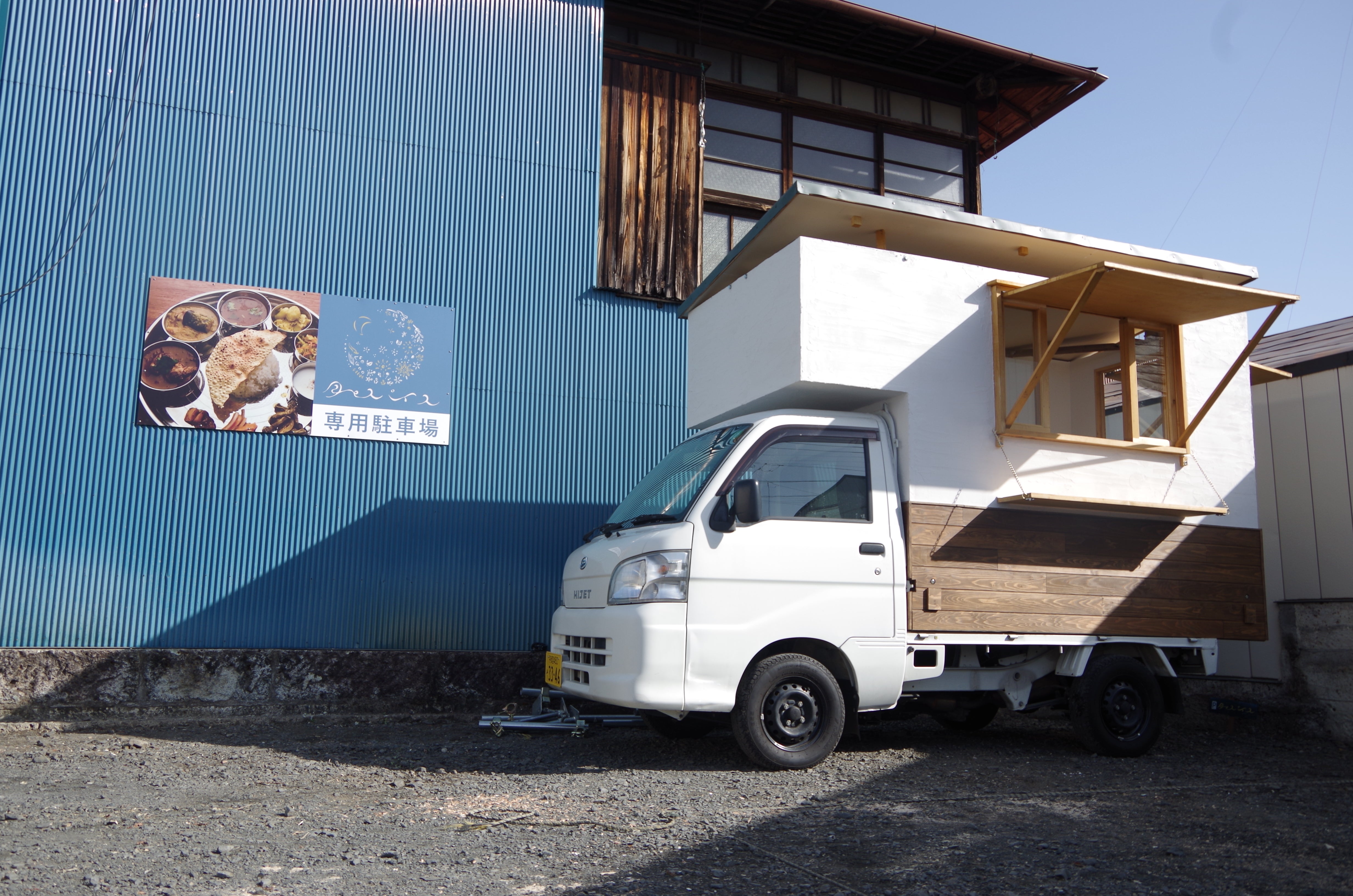 キッチンカーはオーダーメイドで製作しました。まず軽トラックを購入し、荷台部分に手作りのキッチンを取り付けました。月とスパイスの雰囲気やコンセプトに合わせてデザインして、友人大工に製作してもらいました。