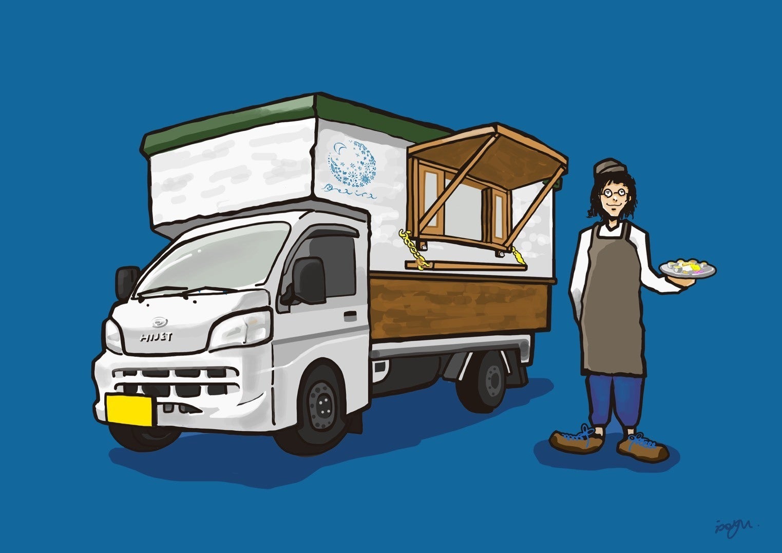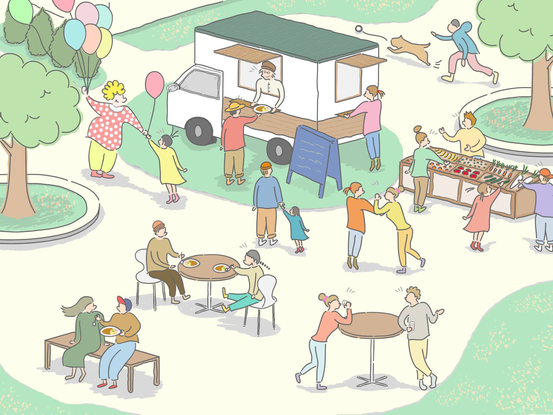 キッチンカーで作りたい未来のイメージをイラストにしてもらいました。ベンチを出して外で食べたり、ちょっとしたマルシェを開いたり、沢山の方が憩う空間を皆様と描いていけたら嬉しいです。