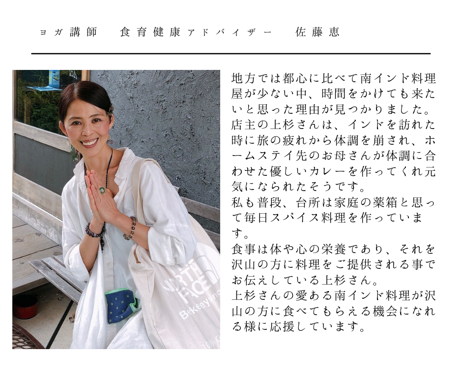 直売所で地元の農家さんから新鮮な野菜を購入して、その場で作ったりできたら最高です。月とスパイスの目指すカレーは、インドのホームステイ先のお母さんが作ってくれたような優しくてホッとする味。心と体を満たして元気にしてくれる愛情たっぷりのカレーです。