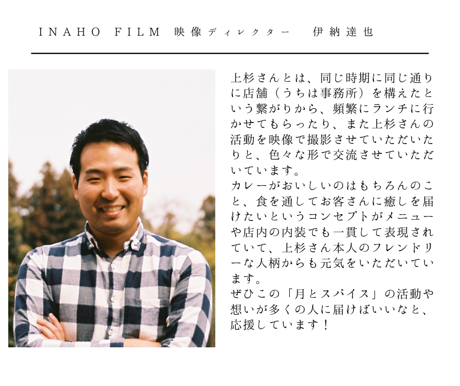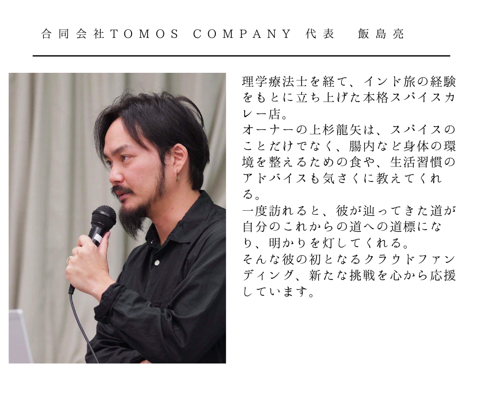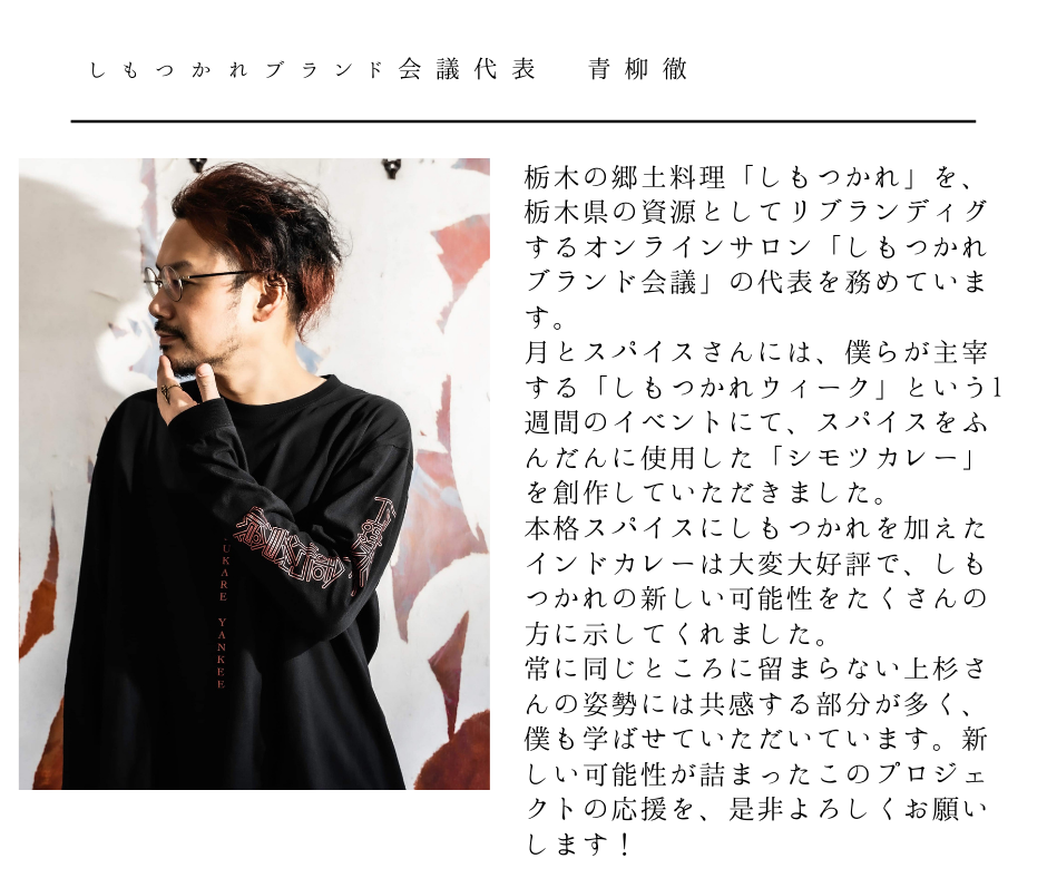 栃木県鹿沼市にあるカレー店「月とスパイス」店主の上杉龍矢です。ご存知の方もはじめましての方も、当クラウドファンディングページをご覧下さりありがとうございます。