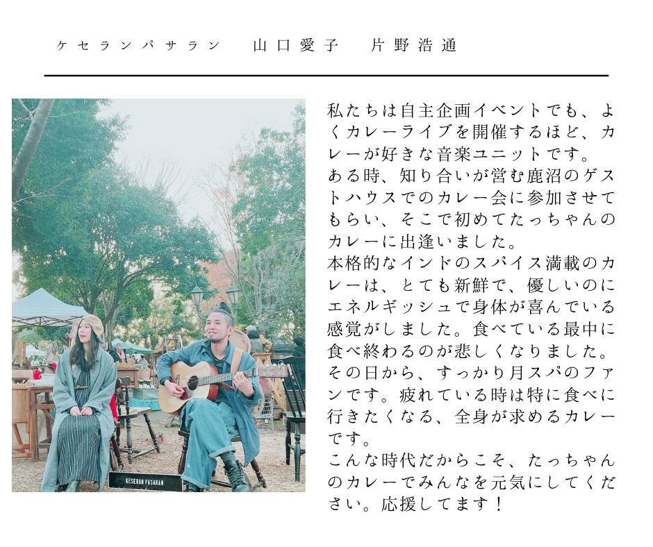 地元でお世話になっている人や、同じ志を持ったカレー仲間、月とスパイスでライブをしてくれたミュージシャンなど、いつも月とスパイスを支えてくれる方々から応援メッセージを頂きました!