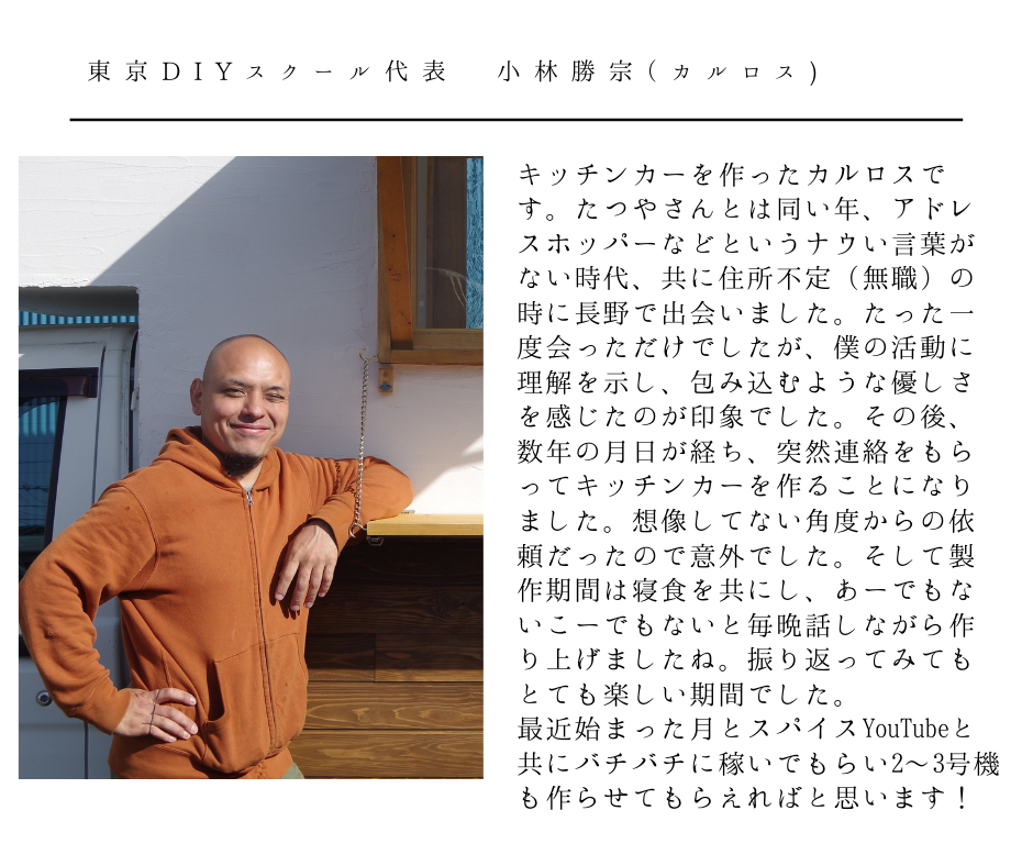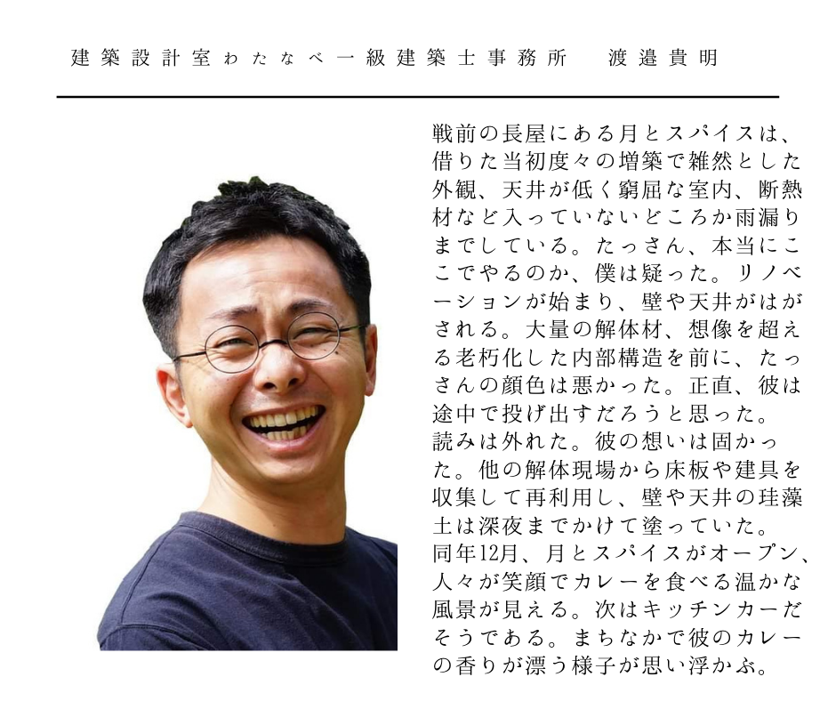そしてキッチンカーを作ることでその輪を広げ、より多くの人に月とスパイスのカレーをお届けしたい。そうして新たな繋がりや出逢いが生まれ、地域の健康や暮らしを支えていくことができれば幸いです。