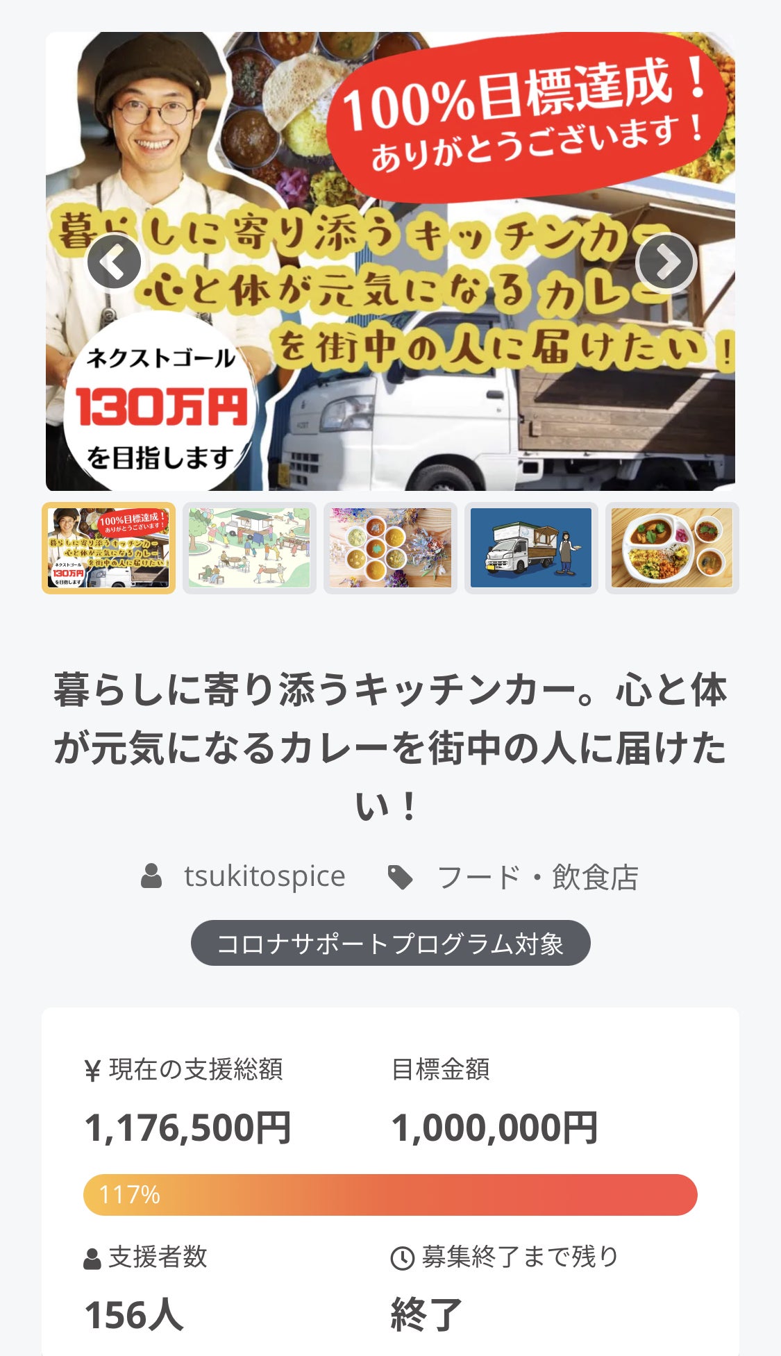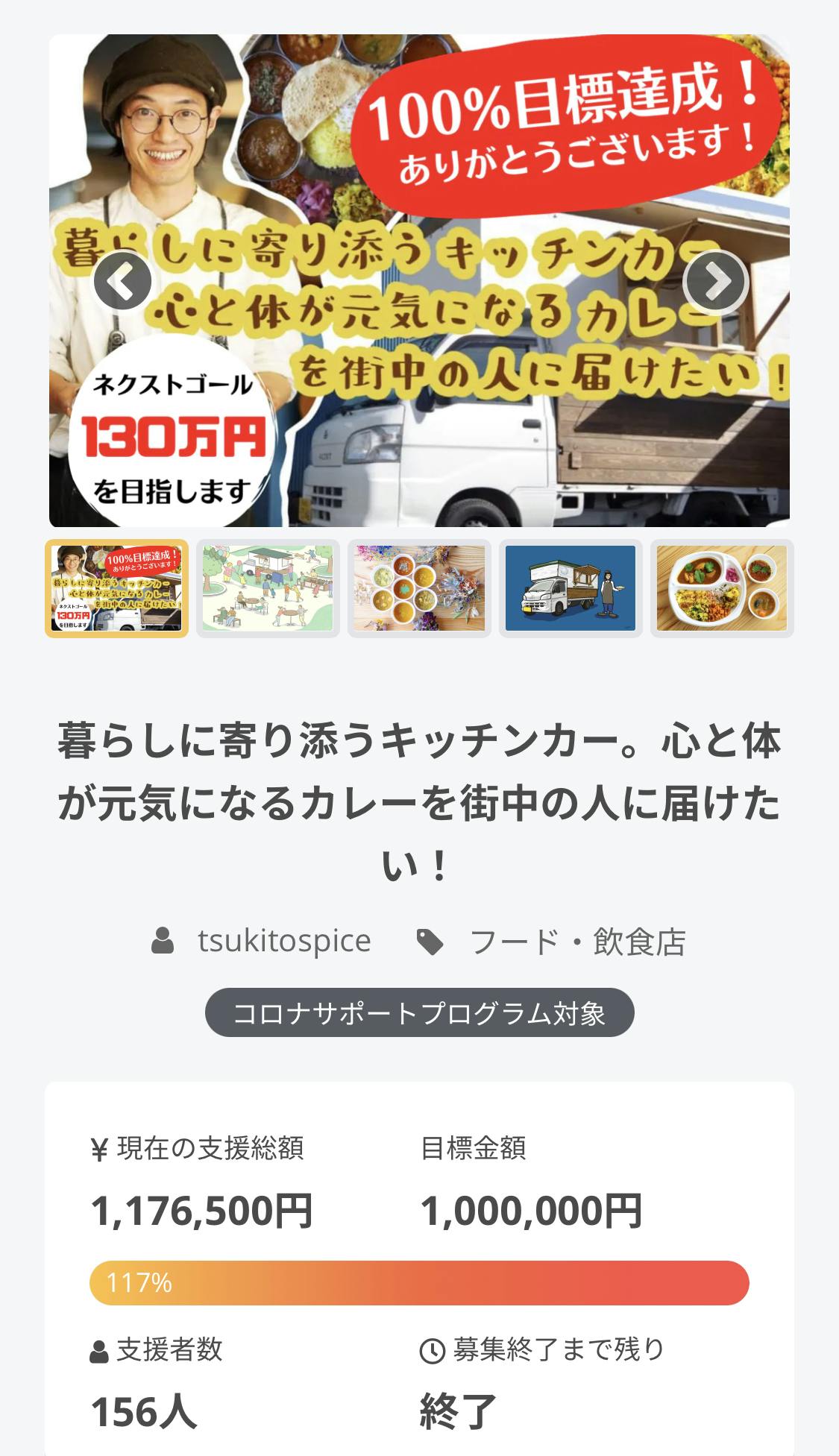 2021/07/28 10:54応援してくださった皆様へ月とスパイス初となるクラウドファンディング、皆様のご支援やご協力のおかげで、無事に達成することができました。1,1765,000円のご支援を156名もの方からいただきました。本当にありがとうございます!ここからキッチンカーの内装や手続きを済ませ、9月〜10月から始動していきたいと思います。皆様にカレーをお届けできる日まで、今しばらくお待ちください!それと同時に、各リターンの準備を進めております。準備完了したリターンから順次発送して参りますので、今しばらくお待ちください。本当にありがとうございました。今後ともよろしくお願いいたします!月とスパイス代表 上杉龍矢月とスパイスの情報発信はこちらからInstagram:https://www.instagram.com/tsukitospice/Facebook:https://www.facebook.com/tsukitospice もっと見る100%目標達成!ネクストゴールを設定しました。