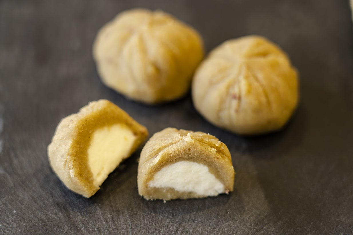 当初、栗ペーストを基準にたくさんのものを足していきました。その結果、本来の栗の味や風味が伝わらなくなっていきました。ラポールのメンバーに加わってもらった新商品開発チームにより、ルセット(フランス語でレシピのことです)の見直しや、引き算の発想で、栗本来の風味を引き出せる味に改良中です。ひとつひとつ丁寧に手絞りで作業し、中には洋菓子店らしく栗と生クリームの王道の組み合わせ。
