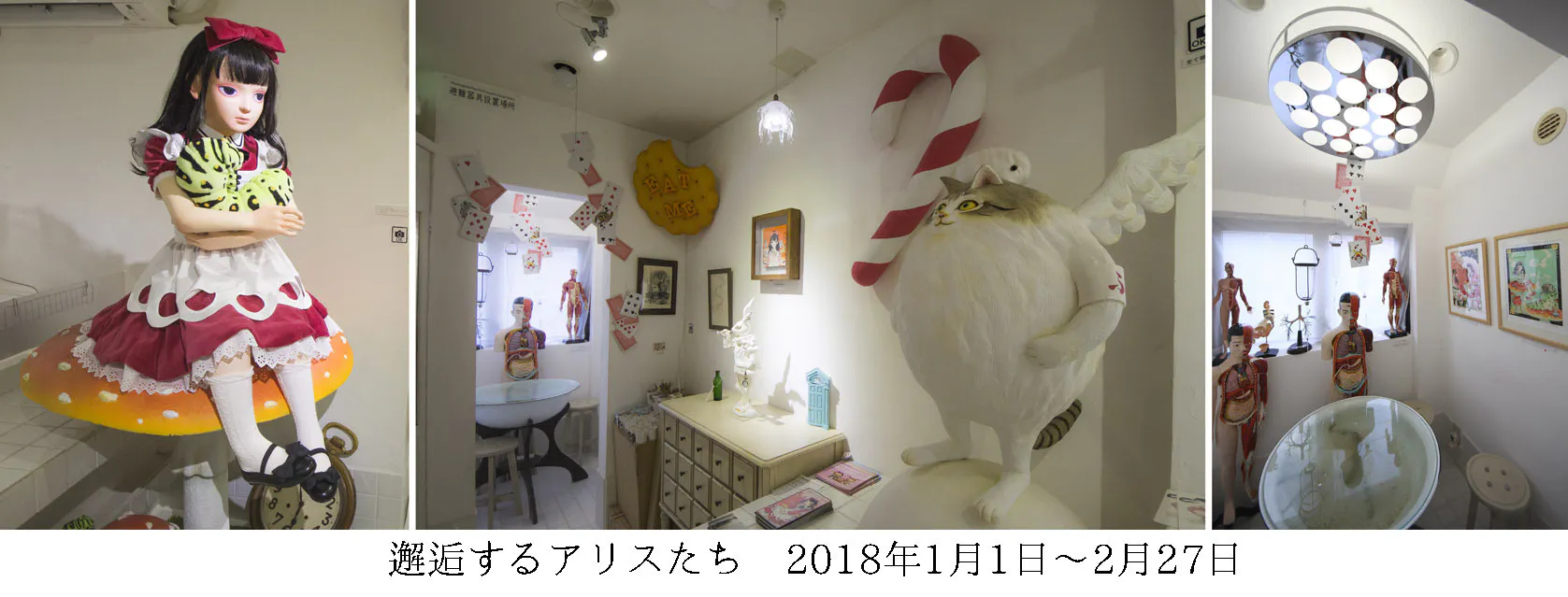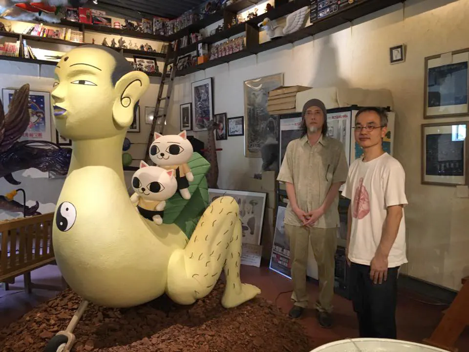 不思議博物館内、左から コロぺた号 にゃっ太 にゃーこ 山野一先生 不思議博物館/サナトリウム館長