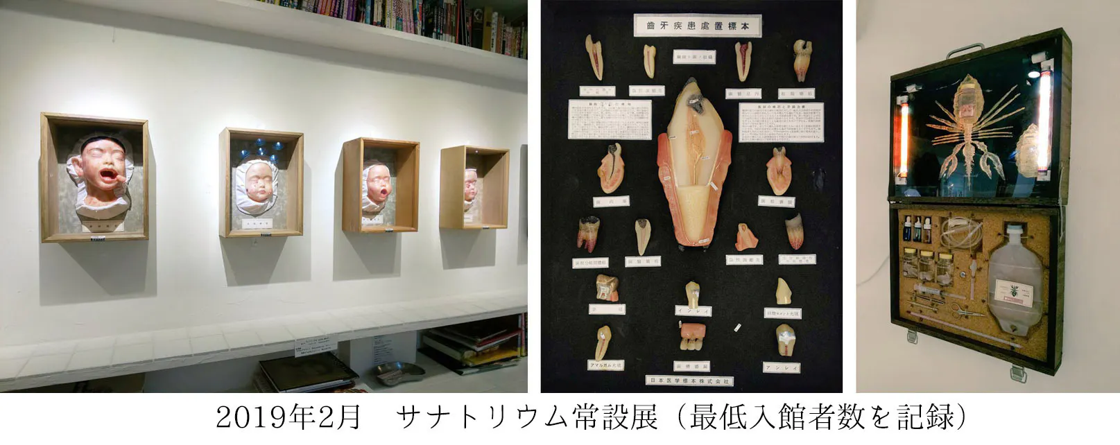 ある時は、昔の医療をテーマにして、戦前の皮膚病の子供の首4つと実物大胎児の蝋人形を展示し、これぞ、サナトリウムの展示だと自信満々に設営したら、過去最低入館者数を記録し、スタッフの数人からは「館長、あの展示は無いですよねwww」と、非常に残念な結果に終わったことがあります。逆に、最高の展示だと言ってくれたスタッフやお客様も居ました。