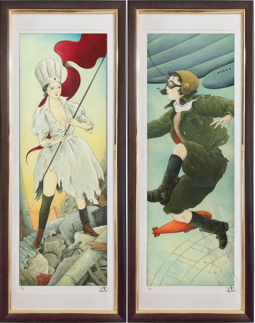 左 竹崎陽子作品「暁の乙女」フレスコジークレープリント 額付き イラスト部分430mm×148mm 額545mm×212mm シリアルナンバー、サイン付き 限定5部 ©竹崎陽子