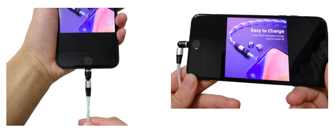 コネクターを機器に差し込む→ケーブル先端を近づける→磁石でくっつき充電開始