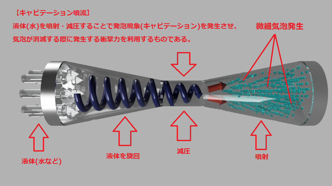 原理:管路の急激な収縮と拡大による気相を粉砕し、ナノバブルを発生させる。