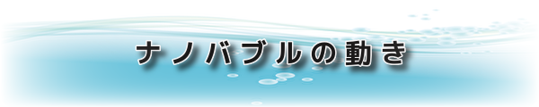 ナノバブルとは水中に漂う超微細気泡の事で、通常の気泡(ミリバブル)やマイクロバブルとは異なる性質があり、目視不可能(無色透明)で極めて小さな気泡の為、水中に長く残存する性質を持っています。