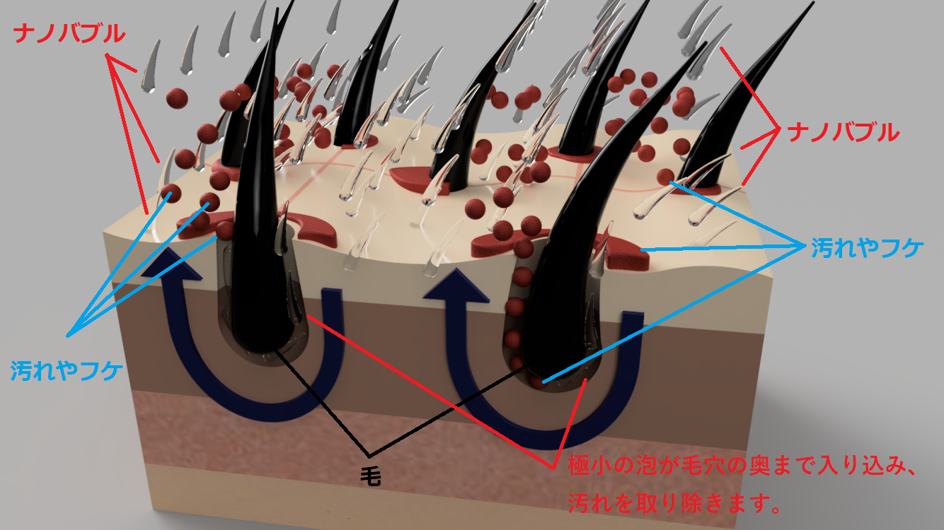 次に皮膚(頭皮など)や洋服の繊維に入り込んだナノバブルの動きをご説明させて頂きます。