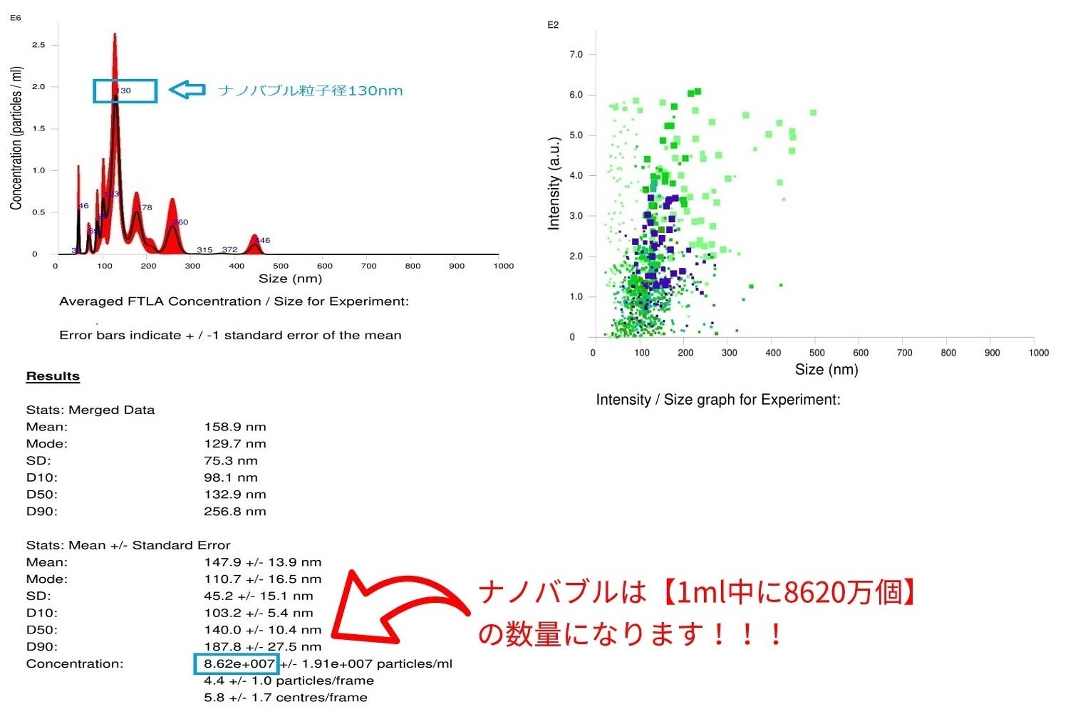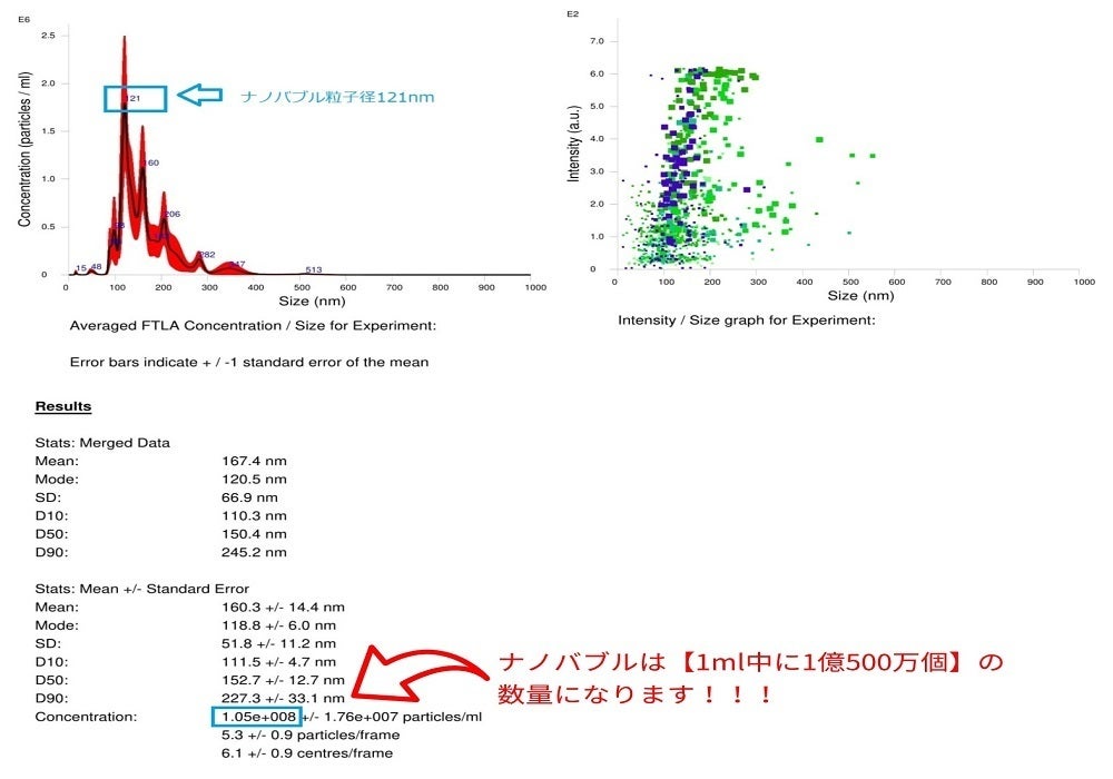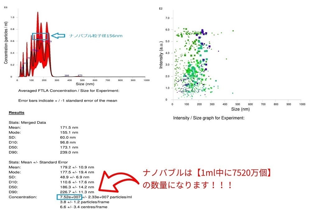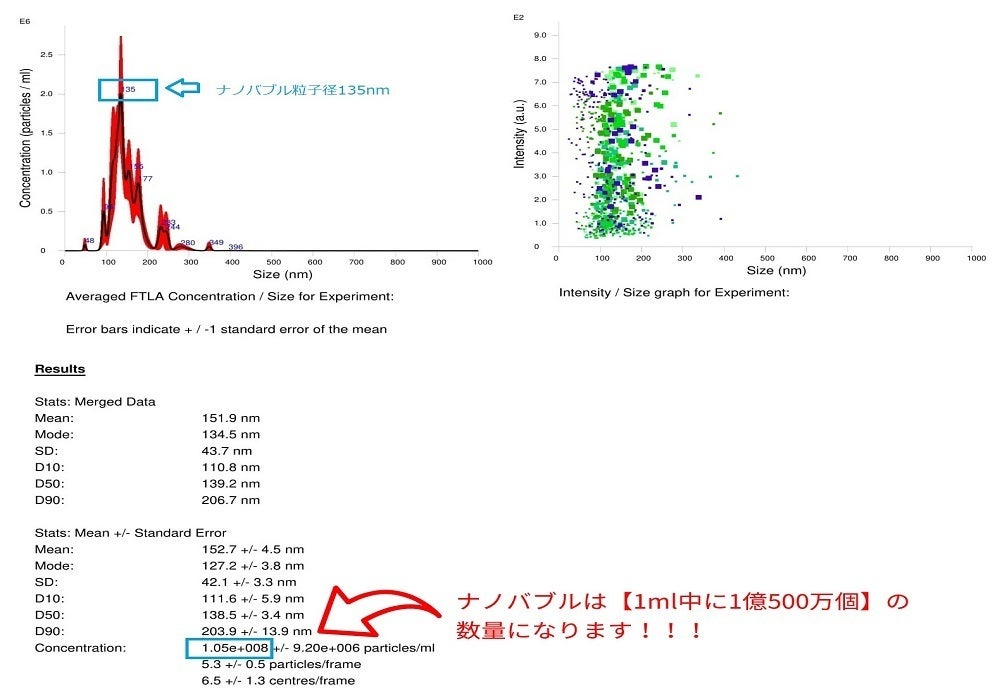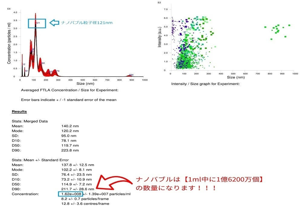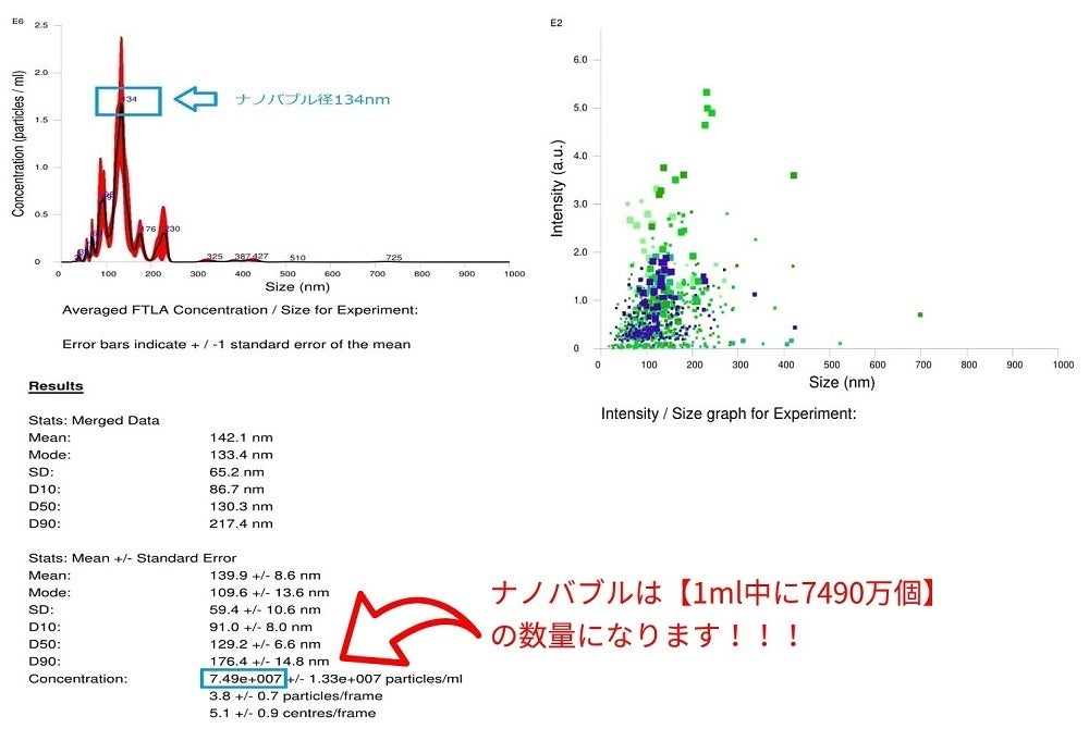 ④画像上部の青文字は1ml中で一番ナノバブル粒子数が多くかつその時の粒子径(nm)を表示