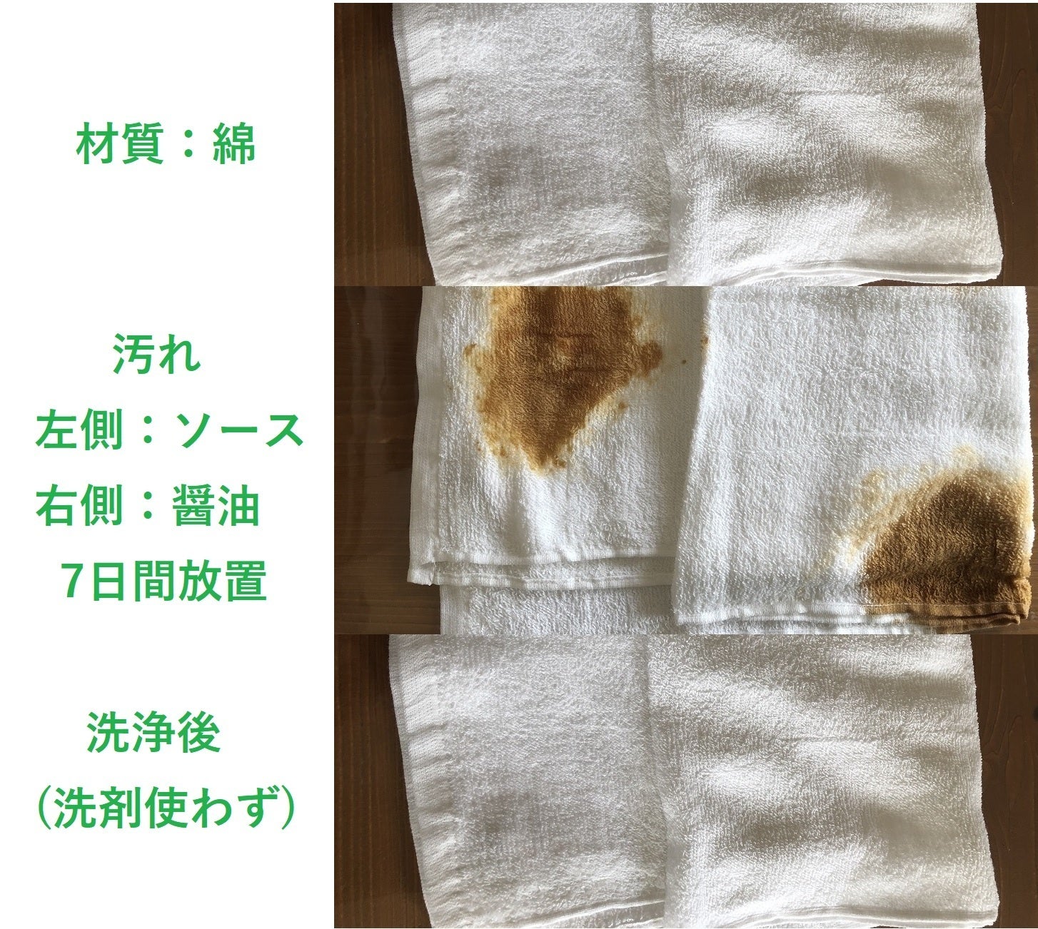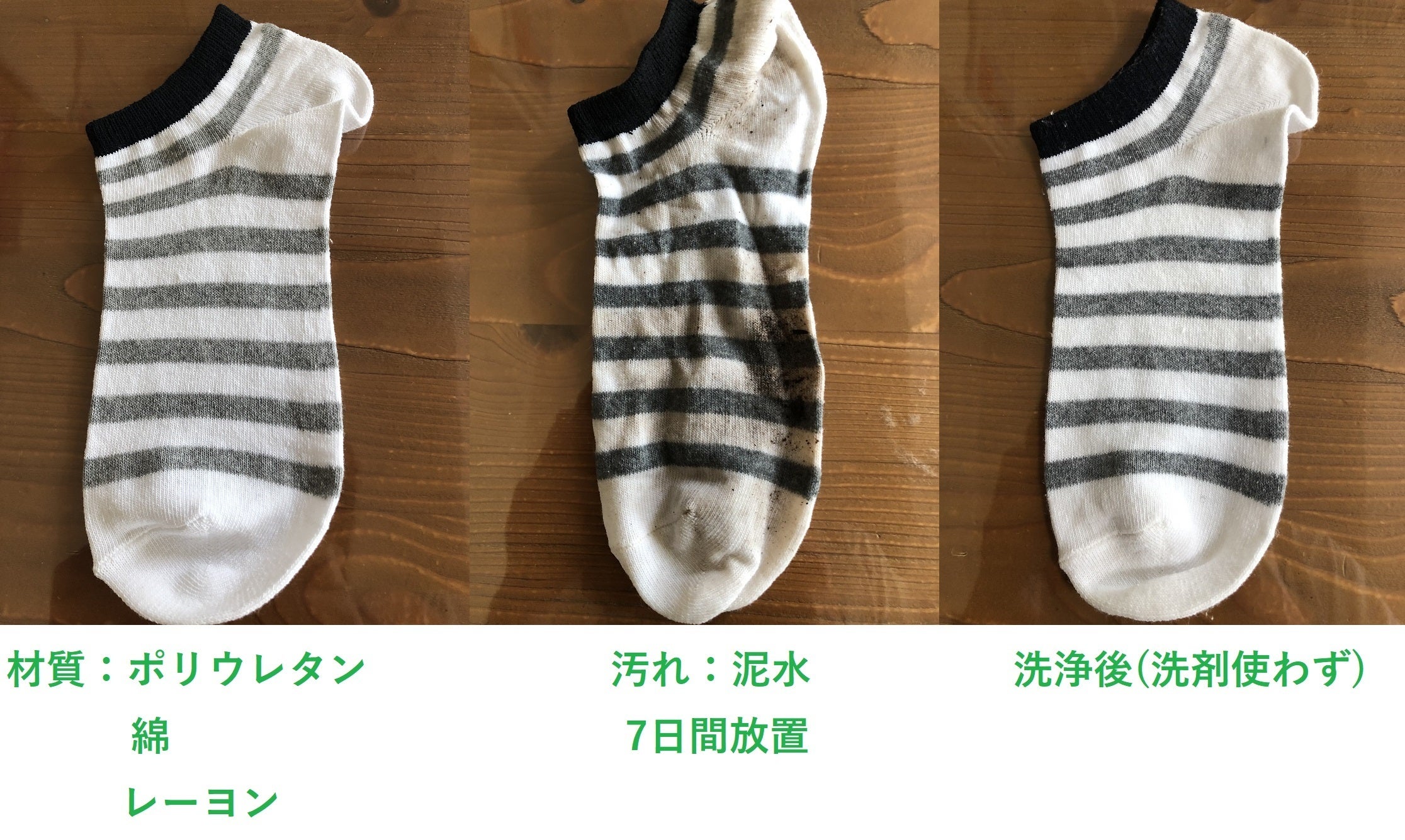 バスタオル・Tシャツ・くつ下に汚れをつけて「洗浄前」「洗浄後」を比較してみました。