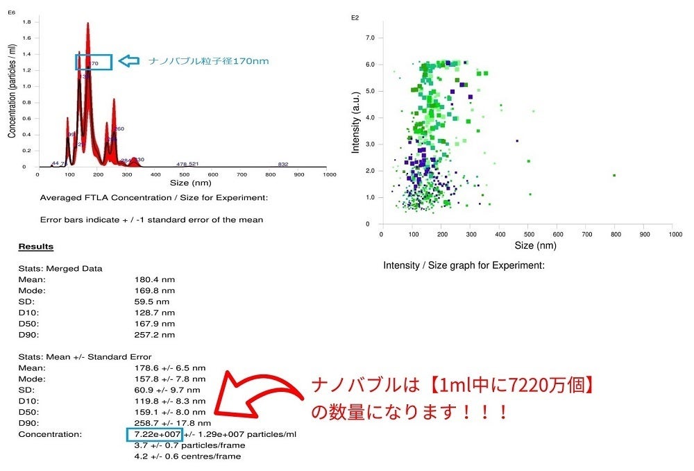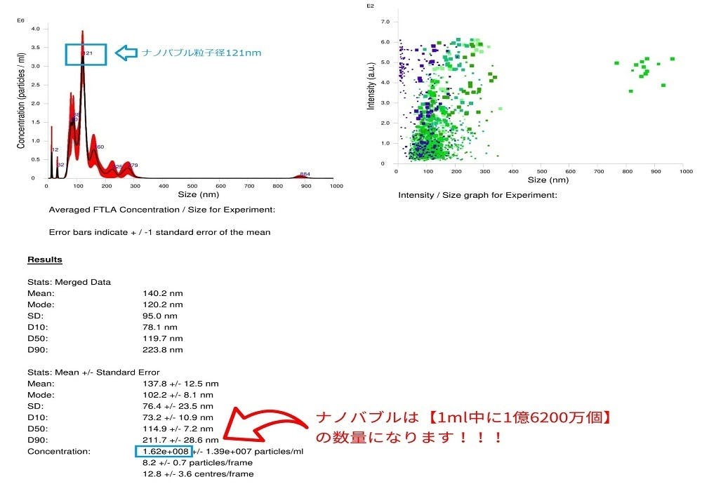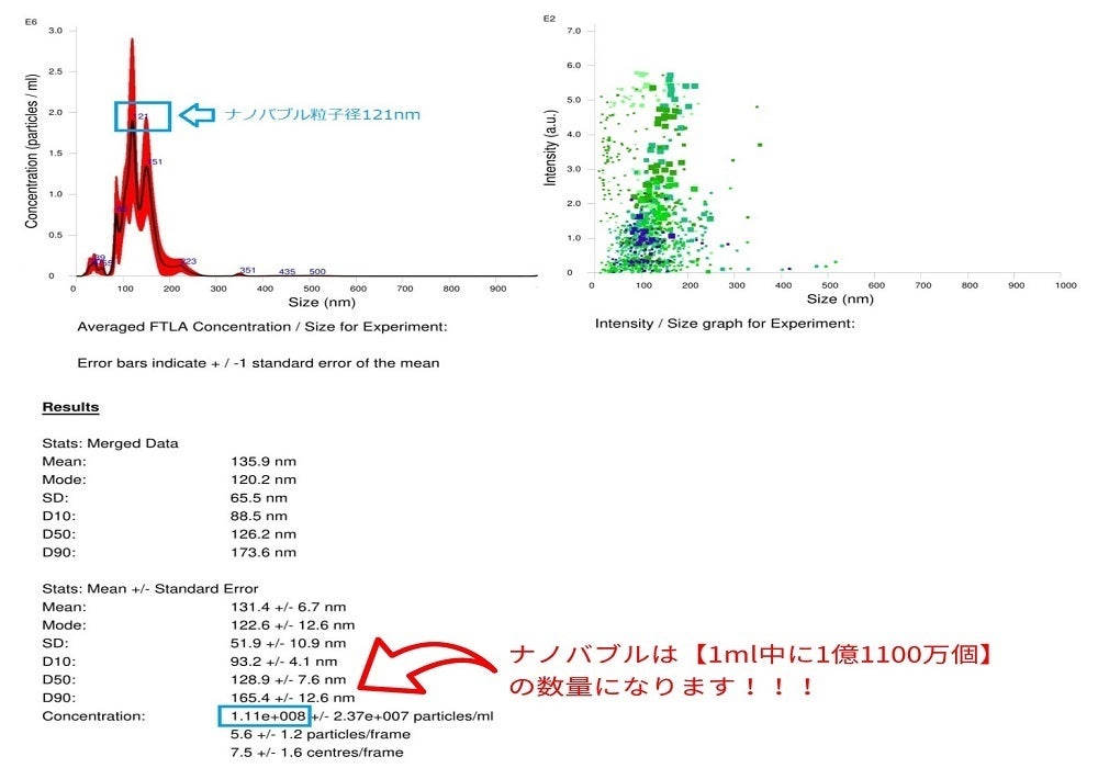 ⑤画像下部の赤文字は1ml中のナノバブルの数量を表示