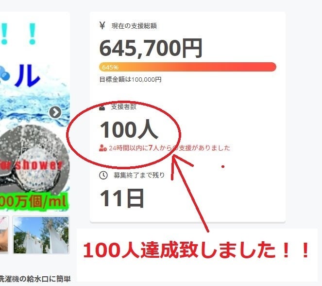 ご支援者数が100人を超えました。この結果は全て皆さまのご支援のおかげです。ありがとうございます。残り11日間ですが、最後まで宜しくお願い致します。※終了日は2021年6月26日(土)23:59までとなっております。