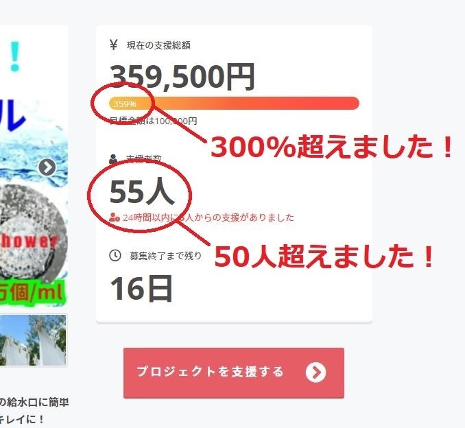 ご支援者数が50人を超えました。更に6月7日(200%超え)から3日後の本日6月10日に達成率300%を超えることが出来ました。この結果は全て皆さまのご支援のおかげです。改めて感謝致します。ありがとうございます。残り16日間と折り返しに入りましたが、最後まで宜しくお願い致します。何かご不明点等がございましたら、ご遠慮なくコメント及びメッセージを頂ければ幸いです。