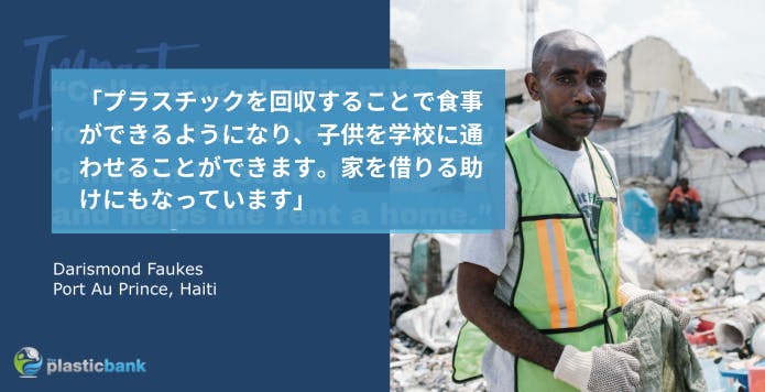 私たちはプラスチック・バンクと手を組んで、プラスチックが売れるように、そして新たな商品に生まれ変われるようリサイクルの基盤を作りました。ここではプラスチックの回収者は市場レート以上の金額を受け取るとこができます。