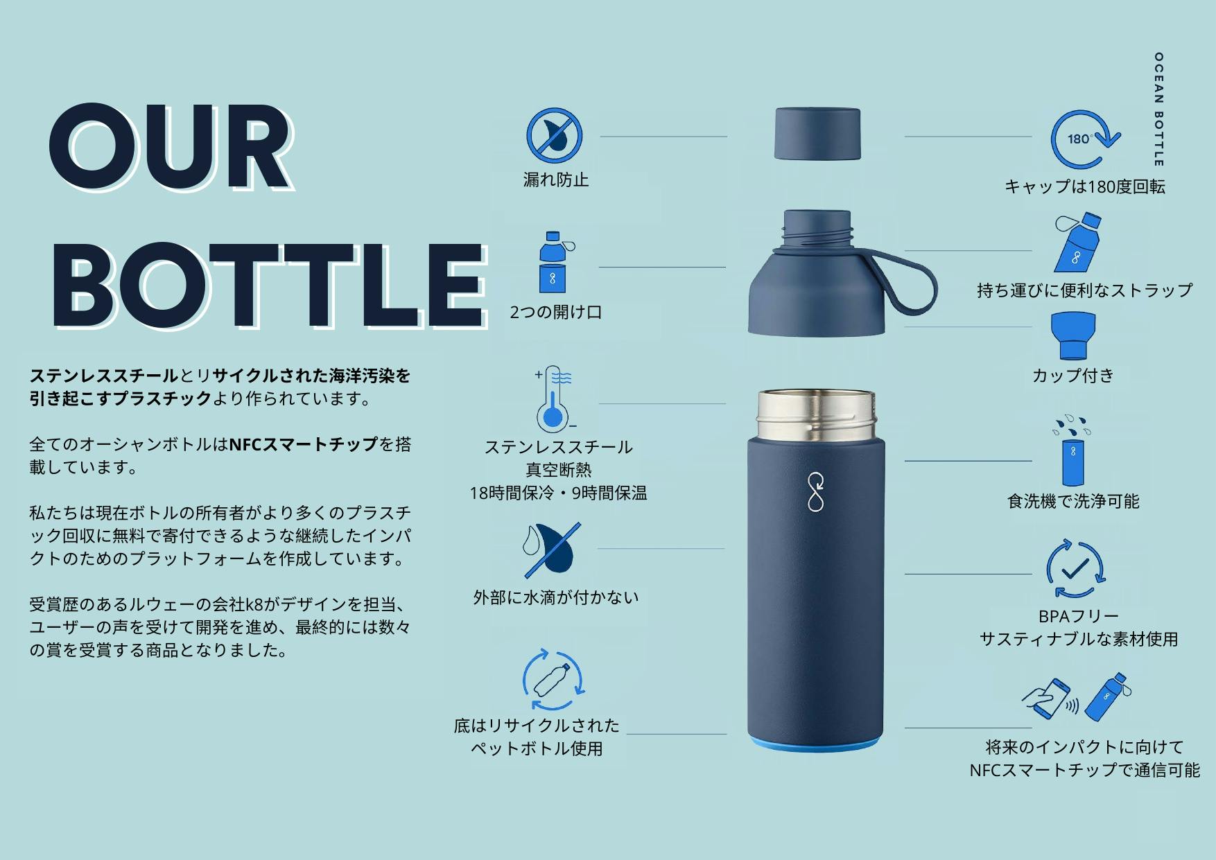 それぞれのボトルはNFCスマートチップ(近距離無線通信)で通信が可能となっており、将来はカフェ、ジム、公共交通機関等でオーシャンボトルにで水が注がれるたびに、個人または団体でプラスチックの回収により貢献できるよう計画を立てております。