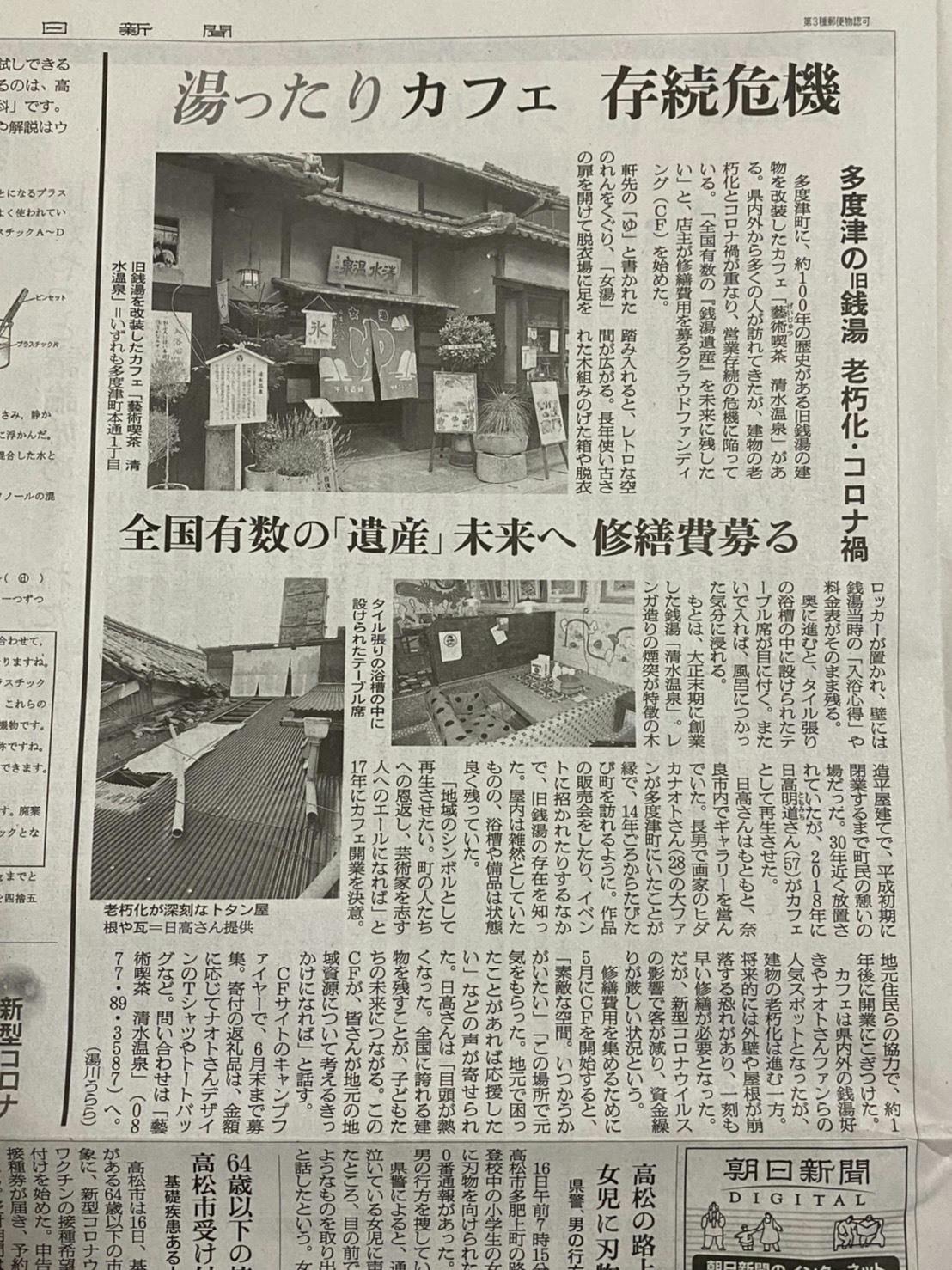クラウドファンディングも残り13日となりましたが、6月17日付朝日新聞香川版朝刊にてプロジェクトのご紹介を頂きました。なかなか伝えきれない現実や建屋の貴重さを少しでもご理解頂けるきっかけになればと思います。残したい一心のあまり個人の思いが前面に出過ぎた感は素直に否めないと振り返っています。ただ、これまでこの貴重な銭湯文化は当代のご家族をはじめ、利活用する私たちはもちろん、未来へ残したいと願う全ての方々と共に歩んで来た場所です。今夏にレンガ煙突周り屋根部からの修繕を実施しなければなりません。順次、可能は限り完工に向けた本プロジェクトを継続していく決意です。どうか、建屋修繕へのご支援を頂ければ幸いです。よろしくお願い申し上げます。