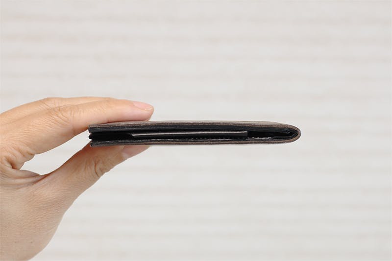 ツインカードスロット ー カード入れを2カ所に分ける事で厚さを分散、でも面積はカード2枚分を並列に並べただけの大きさになっています。カードポケットを折り込み内側から縫製する構造及び山羊革の薄さと伸縮性、強靭さのおかげで実現できました。
