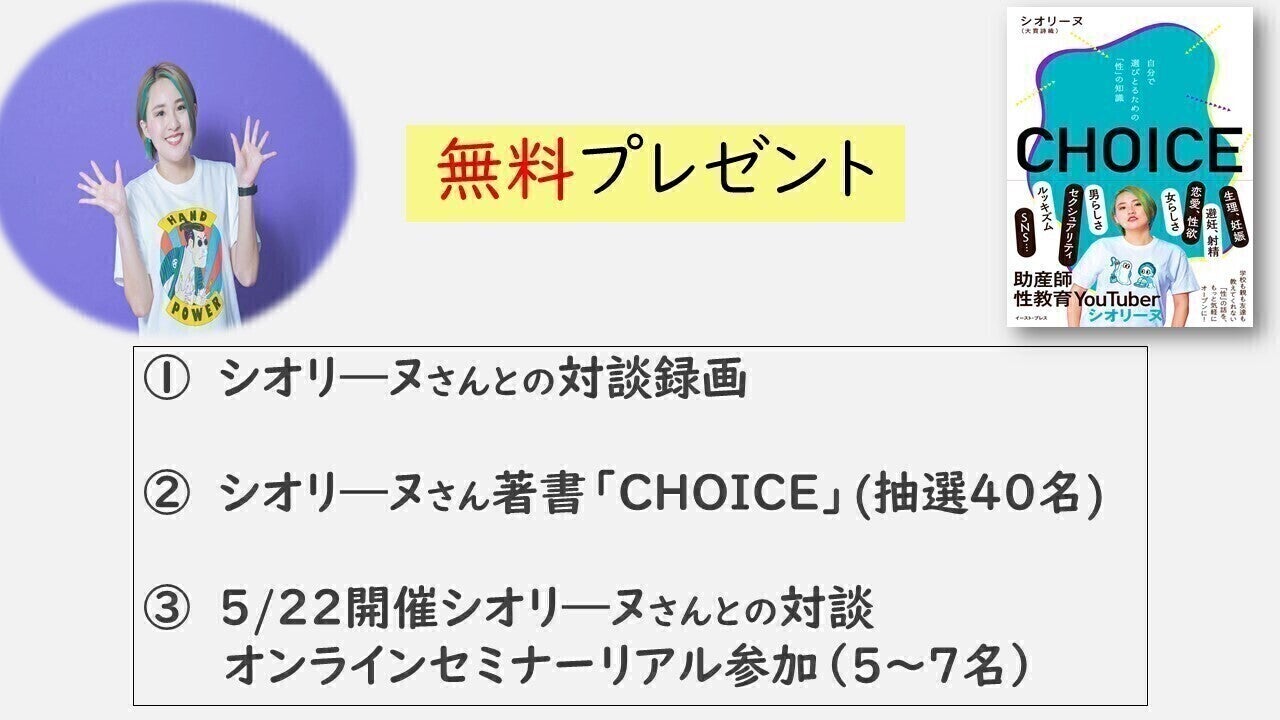 ②→ シオリ―ヌさん著書「CHOICE」(抽選40名)申込フォーム(5/10まで)