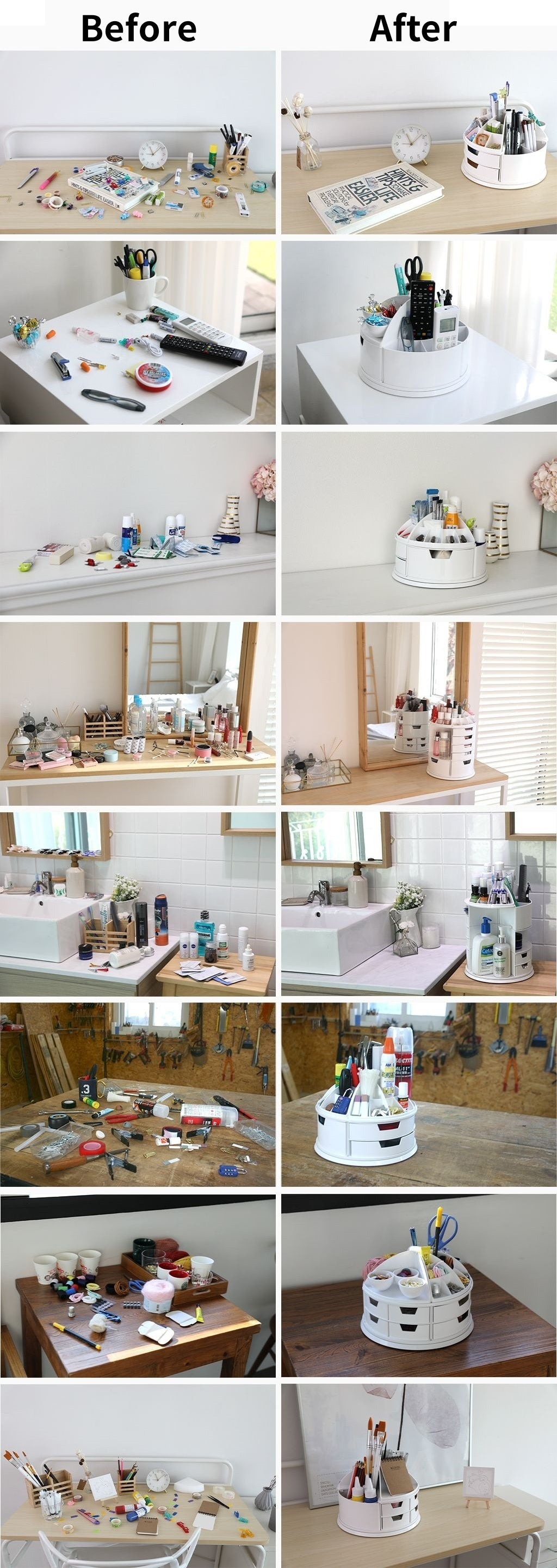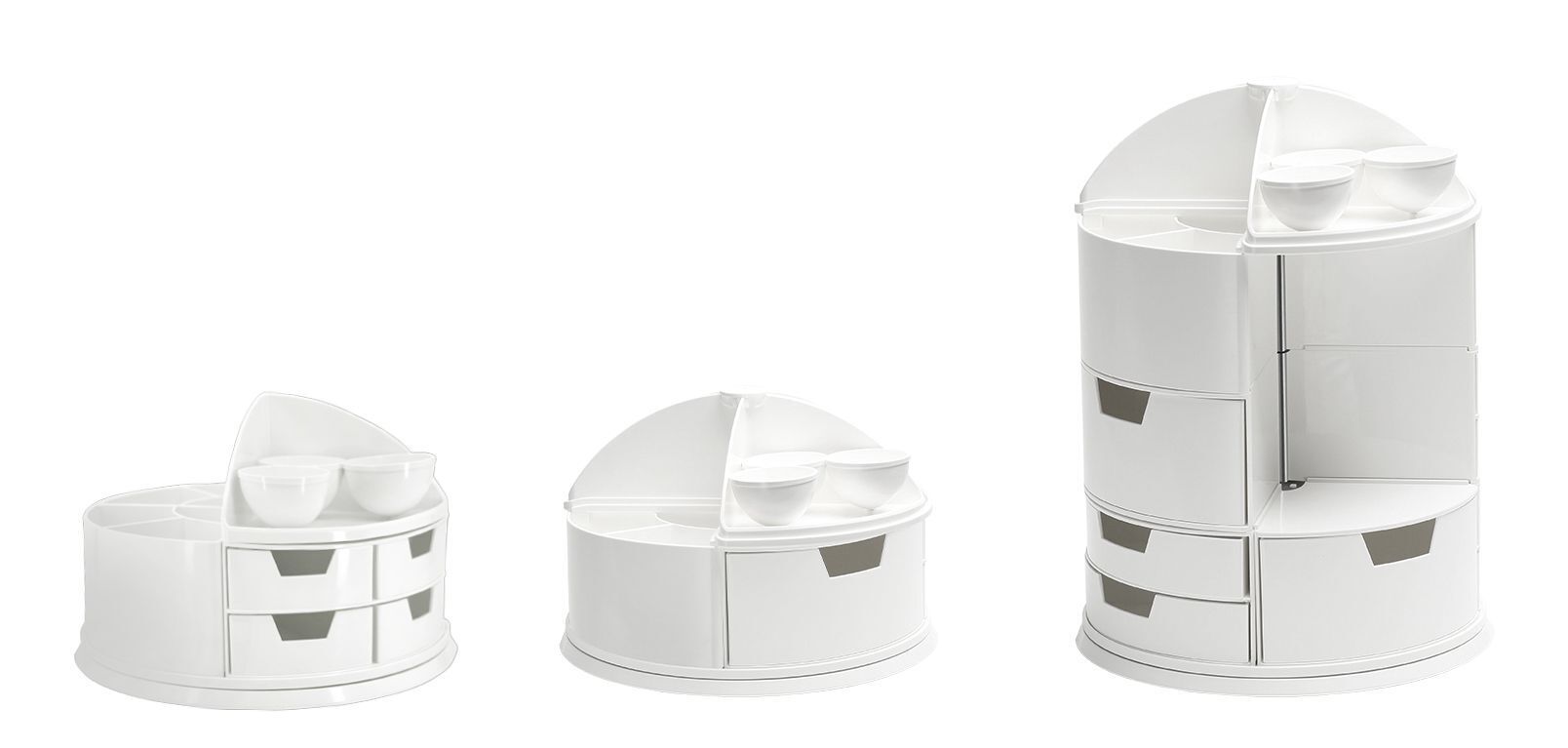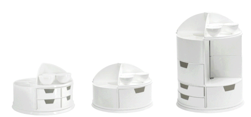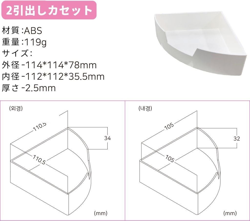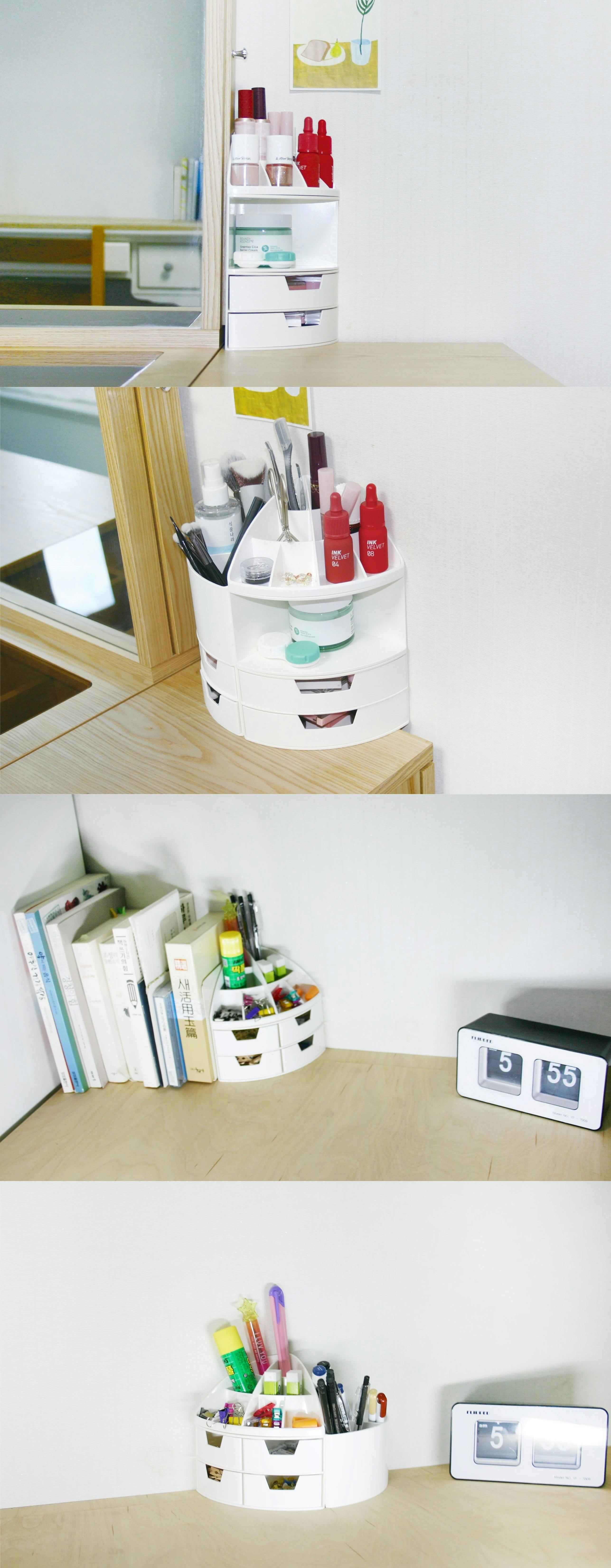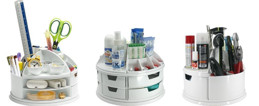 化粧品、バスルームアメニティよう高さのある物を収納するときにお勧め致します。 ソロセット。(固定ピンは使用しません) 多目的収納箱が2つ入ったリモコン、ボールペンなど家の中で頻繁に使用するアイテムに最適です。