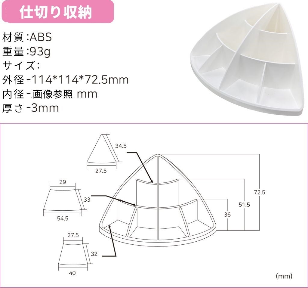 仕切り収納パーツは、口紅の場合、10本ずつ入り収納可能で、アイライナー、ビューラー、アクセサリーなどが入る小物入れです。事務用品の場合ボールペン、接着剤スティック、クリップなどサイズに関係なく、様々なものが収納できます。その他小物と細かいものを分けて整理するのに便利な小物入れパーツです。