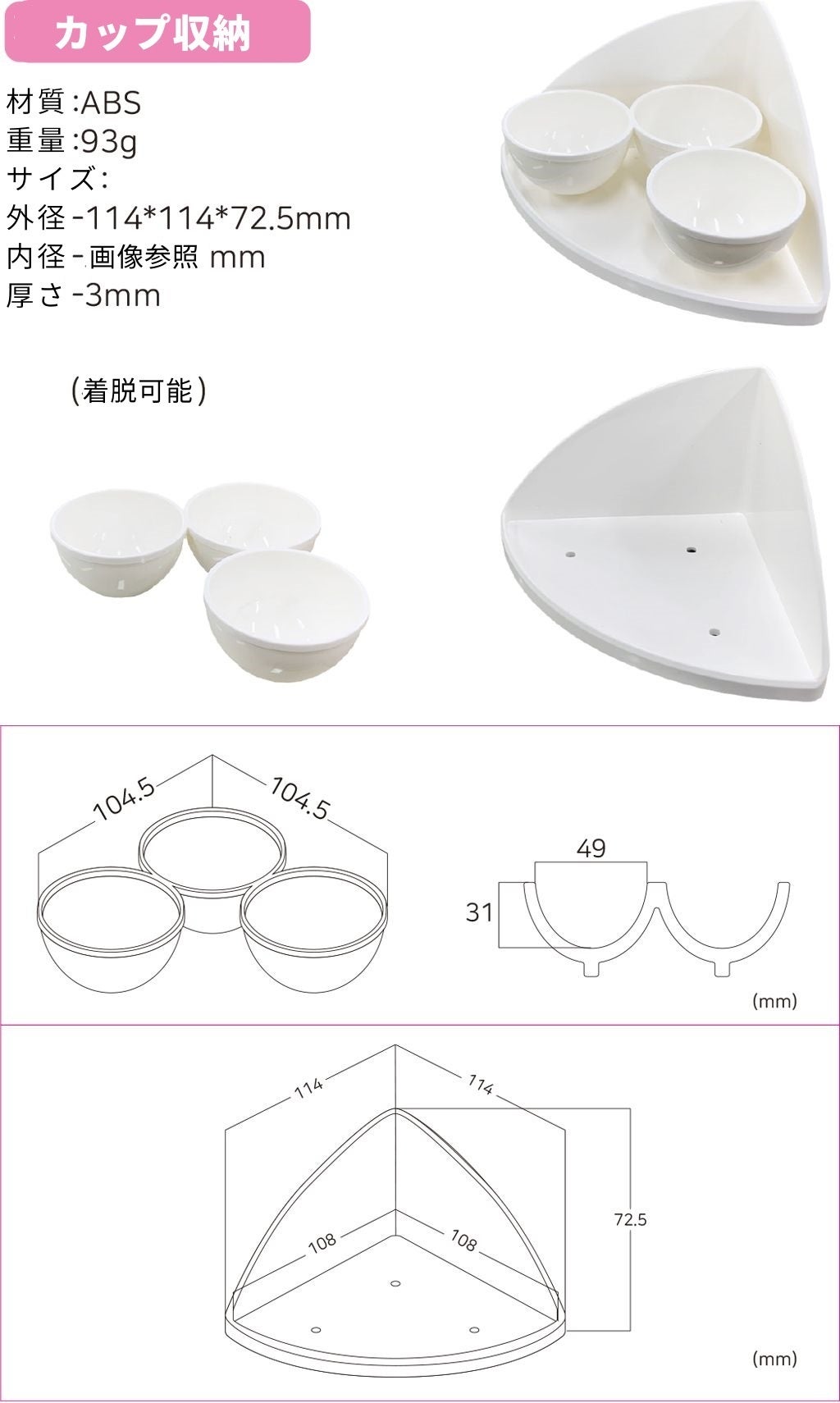 着脱可能なカップ収納の場合、3つのカップ仕様でアクセサリーなどの収納に便利です。事務用品の場合よく使うクリップ、ゴム、消しゴムなどの収納にすればすぐに使用することができます。カップ収納は取り外して使用することも可能です。