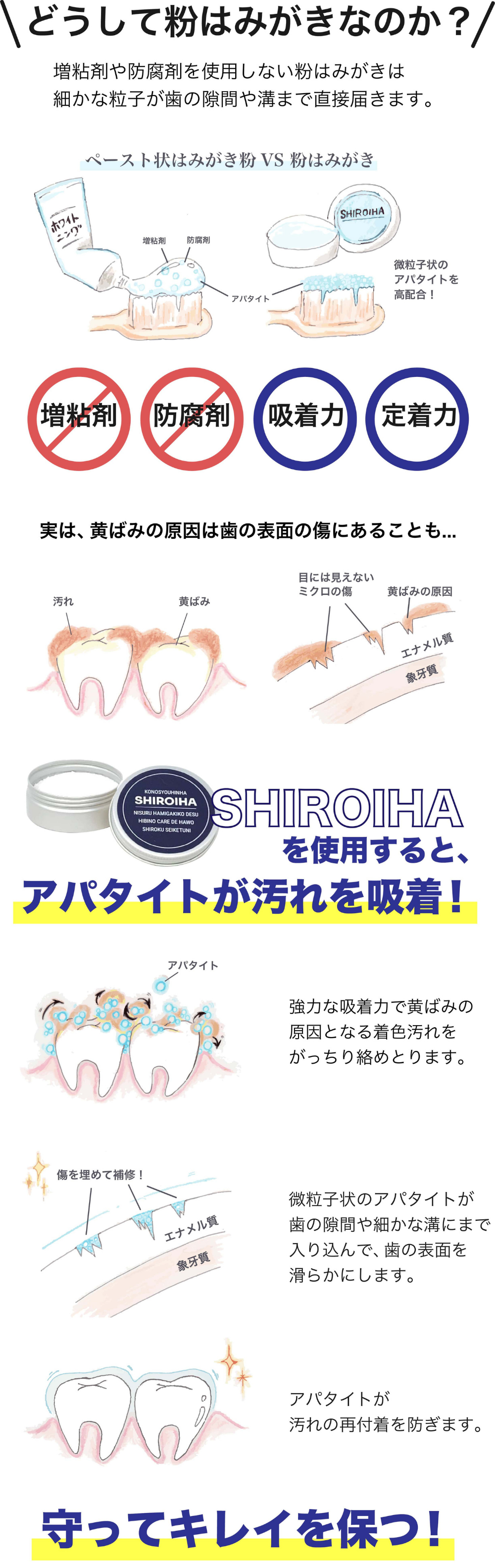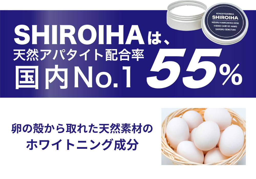 このような思いから「ただ白くするだけではない、ホワイトニング歯磨き粉 SHIROIHA」を制作しました。