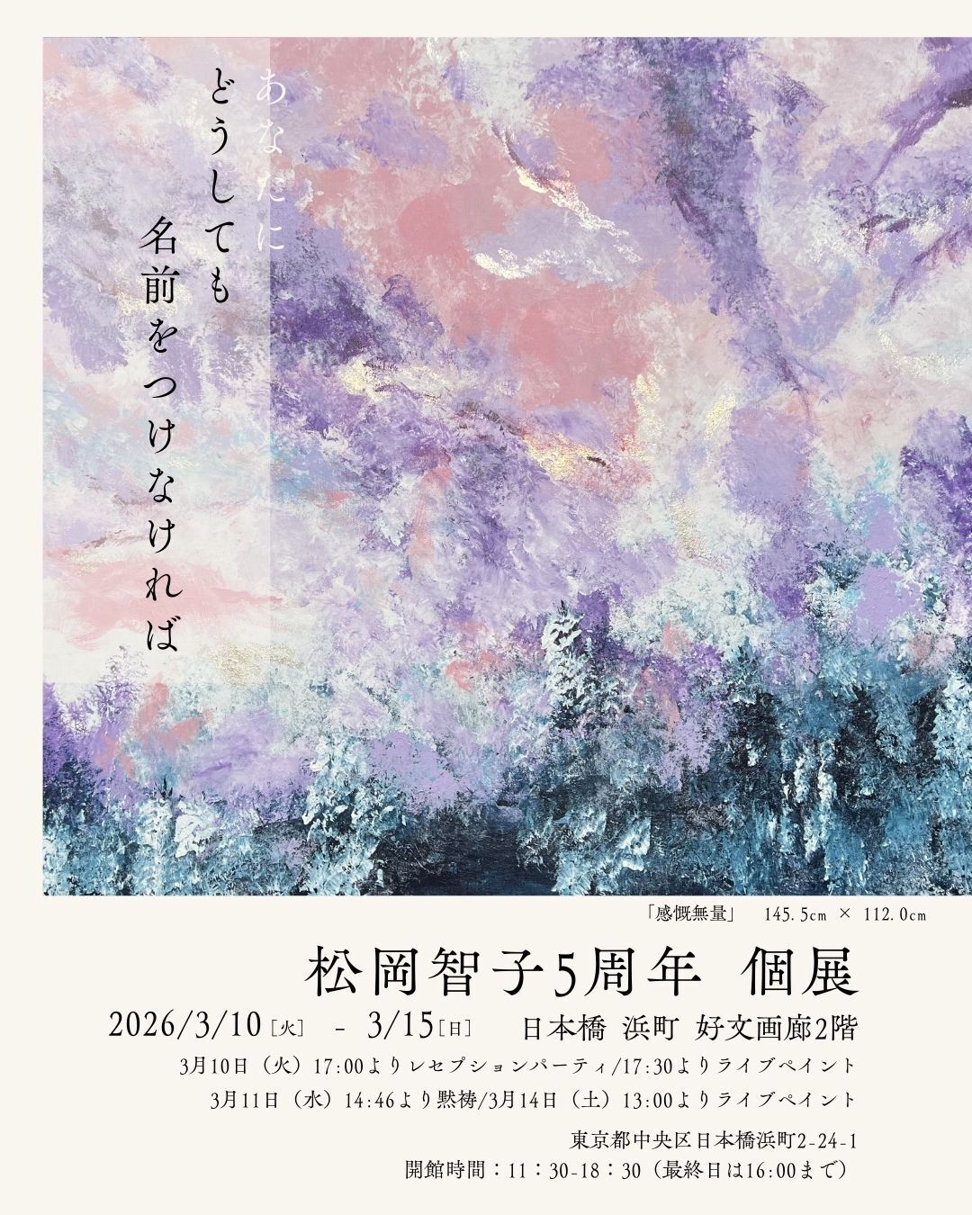 2026/03/06 12:03松岡智子 5周年記念個展「あなたにどうしてもなまえをつけなければ」「あなた」になまえをつける術を、私はまだ持たない。けれど、その存在を私ははっきりと体感しています。 そして、その「あなた」をより良くしようとして、その正体を知ろうとして、探究をやめることができない私がいるのです。レセプションパーティへのご参加はこちらから「あなた」とは何か「あなた」とは、何かを目にした瞬間に誘発される、名付けようのない感情の擬人化です。 美しい、悲しげである、朗らかである――。 単一の言葉では決して括ることのできない、矛盾した感情たちの集合体。 それはときに数ヶ月もの間、胸の奥に居座り続け、離れてくれません。この「あなた」は、あなたが向かいたい未来であり、この街の未来であり、 人類がこれから向かう先で抱く、未踏の感情そのものでもあります。私は「ナッジ(行動を誘発する仕掛け)」という言葉を大学生の頃、研究を続ける中で知りました。ドアノブがあれば、私たちはつい、それをひねり、扉を開けたくなる。 スマートフォンというドアノブを捻れば、私たちは自分の意思とは関係なく、コンテンツを消費するだけの身体へと変貌してしまいます。しかし、かつて私たちが遊び回った「庭」には、もっと自由で、もっと根源的な「ひねりたくなる何か」が溢れていました。 今回の5周年記念個展では、社会をより面白く、より良くするための「装置」として、かつての庭が持っていた機構の再構築を試みています。それは、効率や正解を求めるためのナッジではありません。 会場に点在する「ドアノブ」を捻り、あなたの内側に住まう、名付けられない「あなた」と出会うための実験場です。私たちが再び「生きた表現者」へと還るために。 「あなた」の新しい名前を探すための扉を、共に開けに来てください。【開催概要】会期: 2026年3月10日(火)〜 3月15日(日)時間: 11:30 〜 18:30(※最終日は16:00まで)会場: 日本橋 浜町 好文画廊 2階住所: 東京都中央区日本橋浜町2-24-1協賛:ペベオ・ジャポン株式会社【イベントスケジュール】3月10日(火) 17:00 〜レセプションパーティ 17:30 〜 ライブペイント3月11日(水) 14:46 〜 黙祷3月14日(土) 13:00 〜 ライブペイント もっと見る