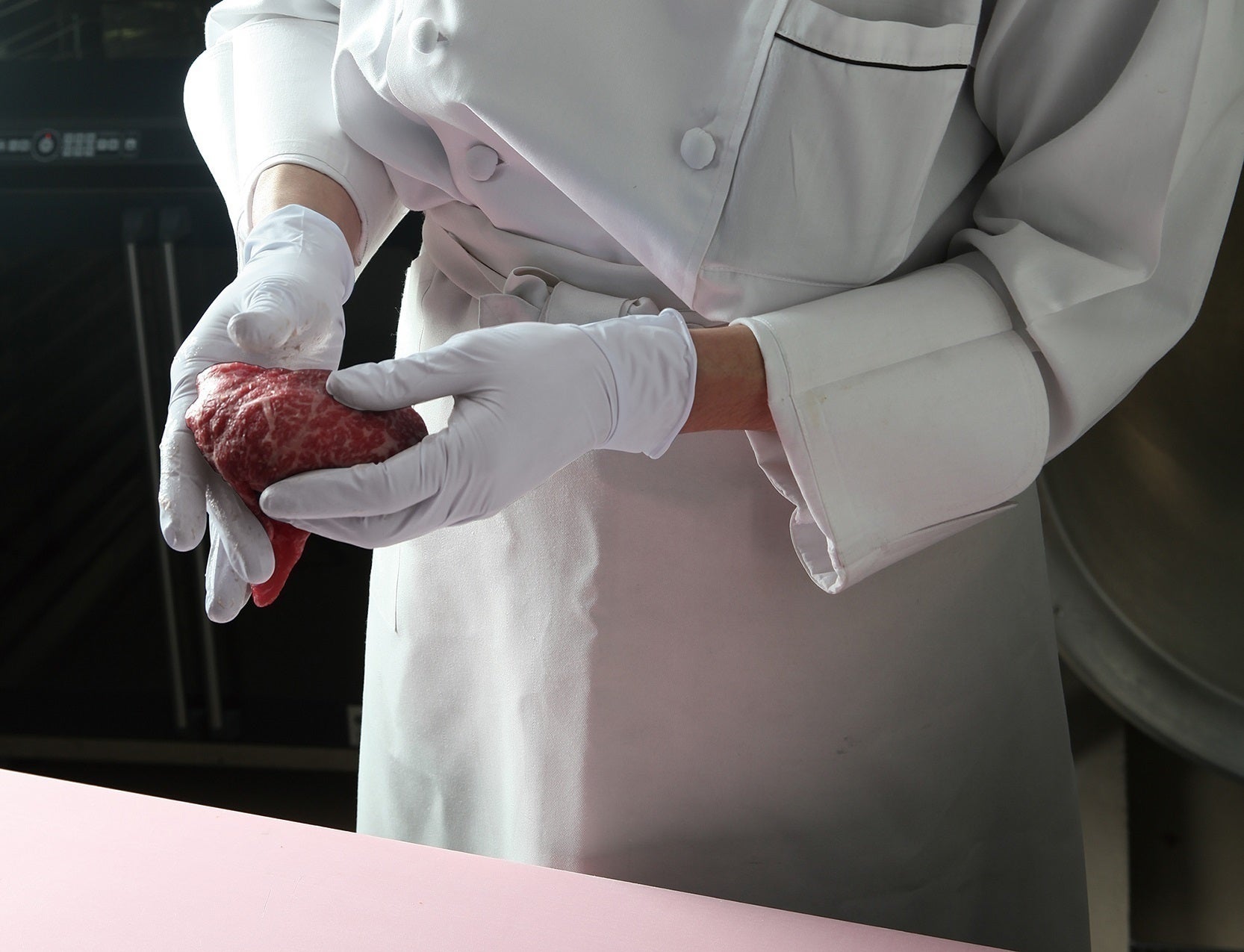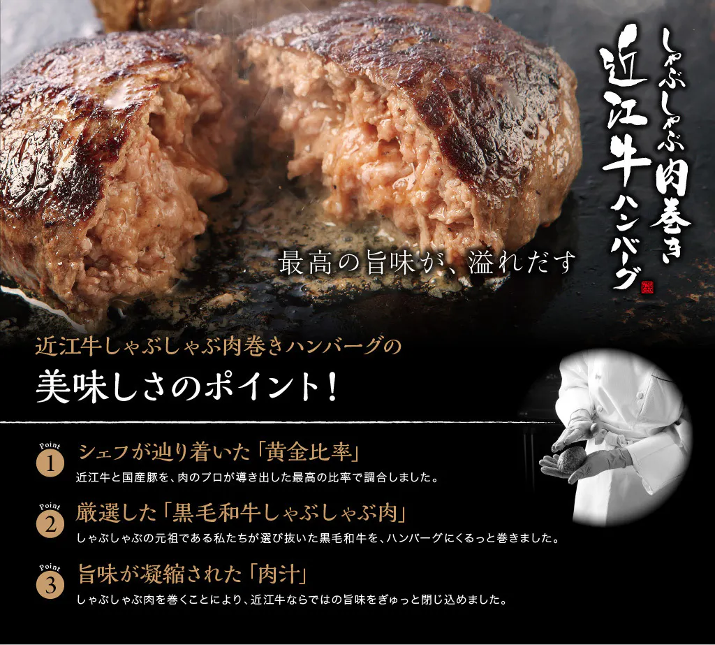 しゃぶしゃぶ肉を巻くことで、ハンバーグに含まれる近江牛の旨味がぎゅっと凝縮され、口の中で肉汁が溢れだします。
