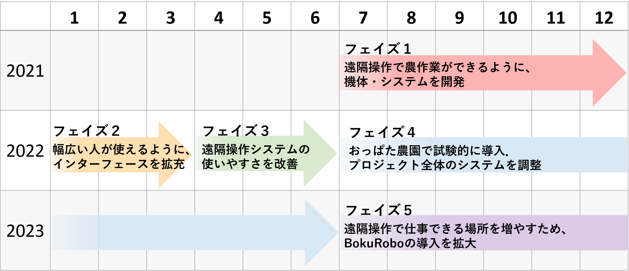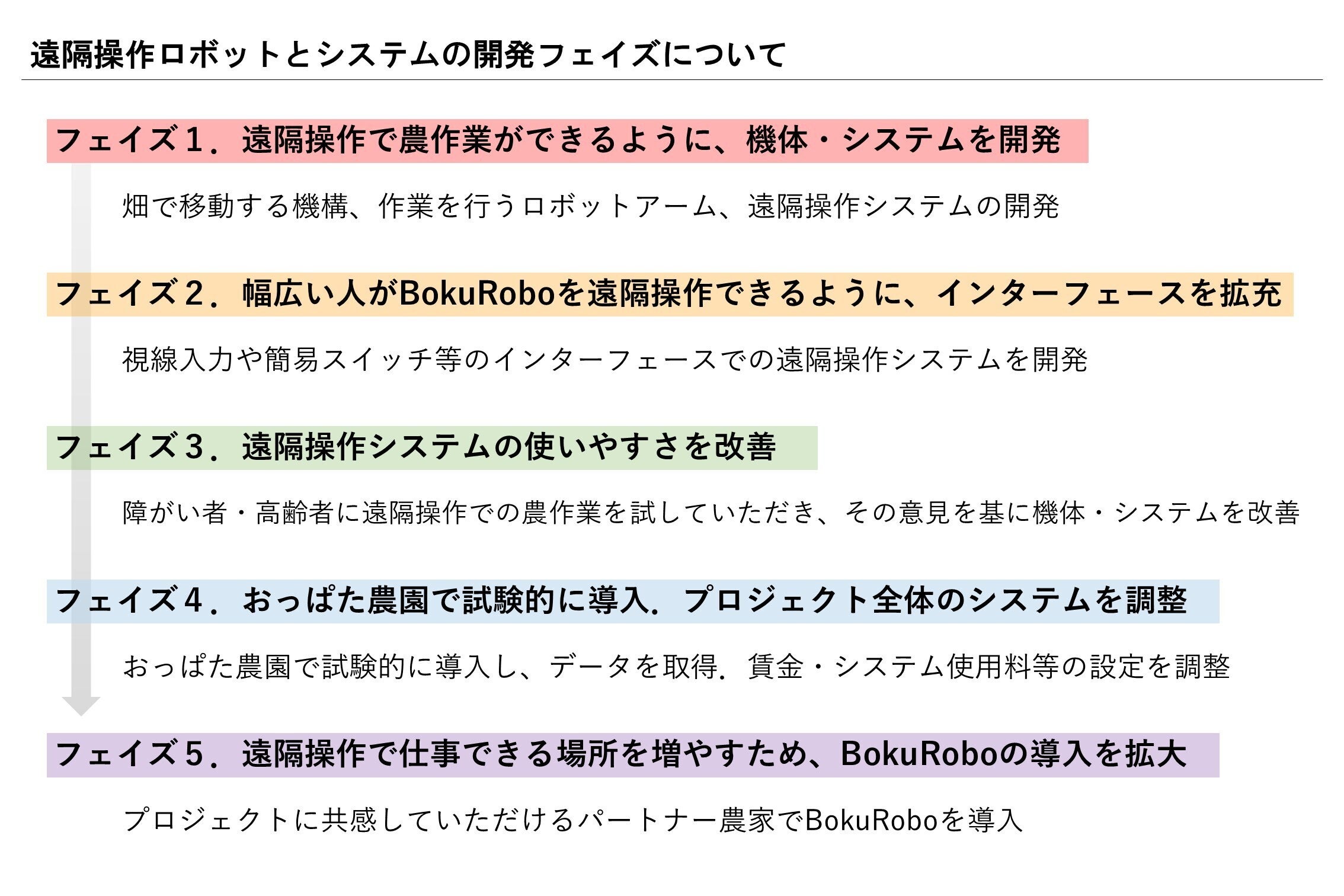 そして、おっぱた農園で試験的に導入しプロジェクト全体のシステムの調整をした後、このプロジェクトに共感していただけるパートナー農園でもBokuRoboを導入していただけるように環境を整えていきたいと考えています。『フェイズ:段階』