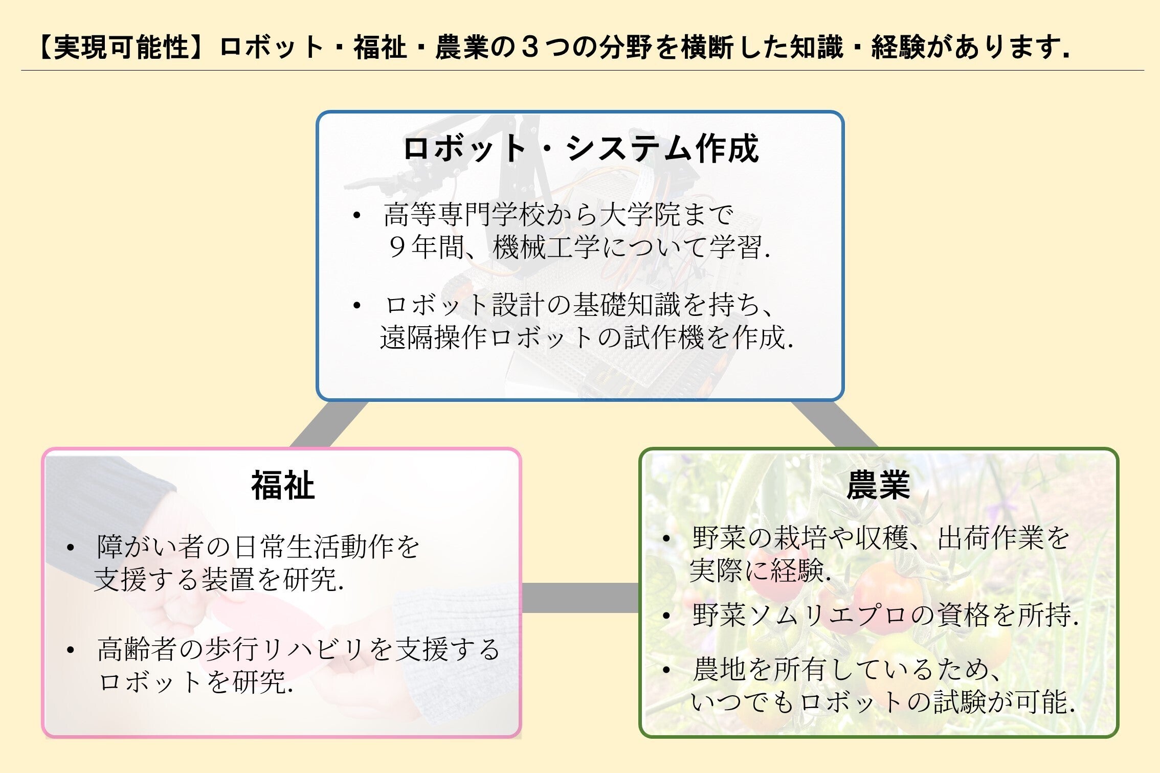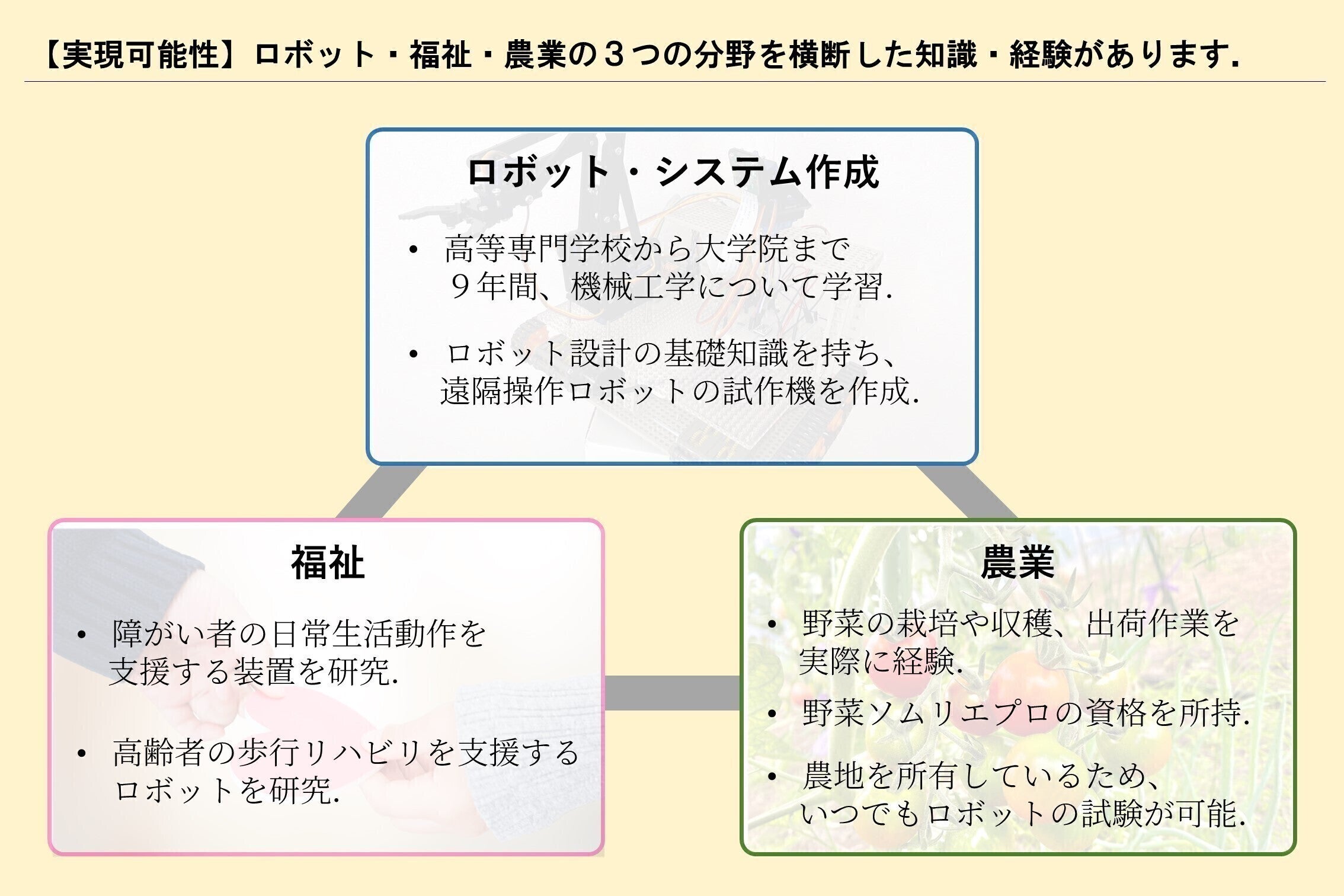 私は働きたい障がい者・高齢者と手伝ってほしい農家をつなぐ、在宅でベッド上からでもロボットを操作して農作業を手伝えるシステムを作りたいと考えています。
