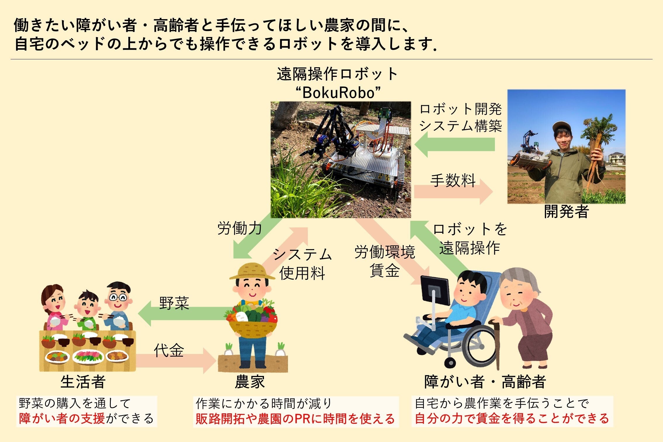障がい者・高齢者と農家の間に遠隔操作ロボットを導入することで...