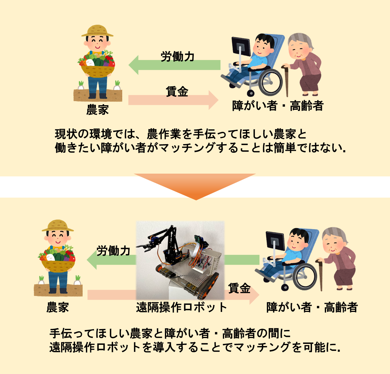 そこで、さきほど述べた身体にハンデがある人の課題と農家の抱える課題の両方を解決するために、働く意欲のある障がい者・高齢者と、手助けを求めている農家のマッチングができたらいいのではないか?と考えました。『マッチング:結びつけること』