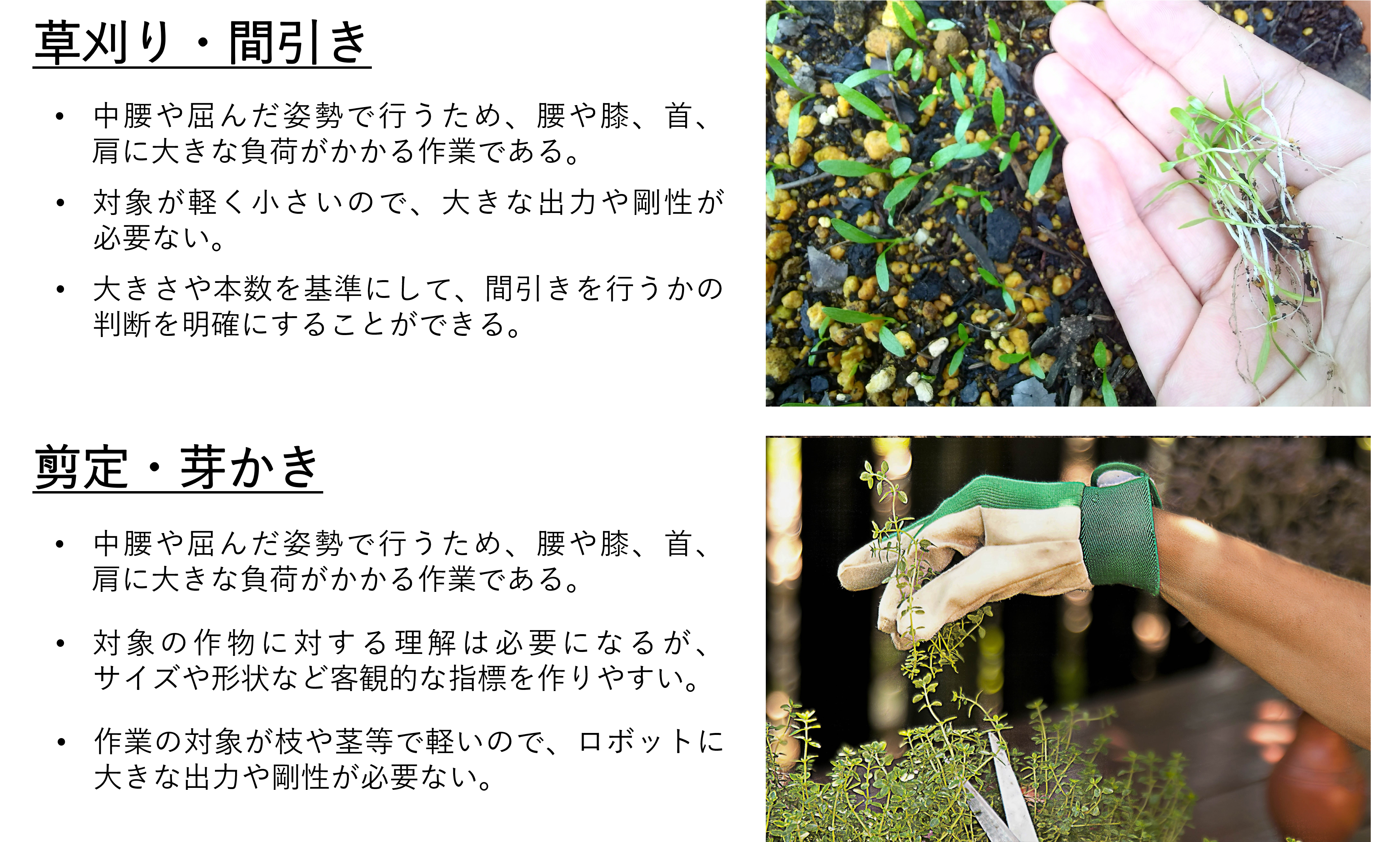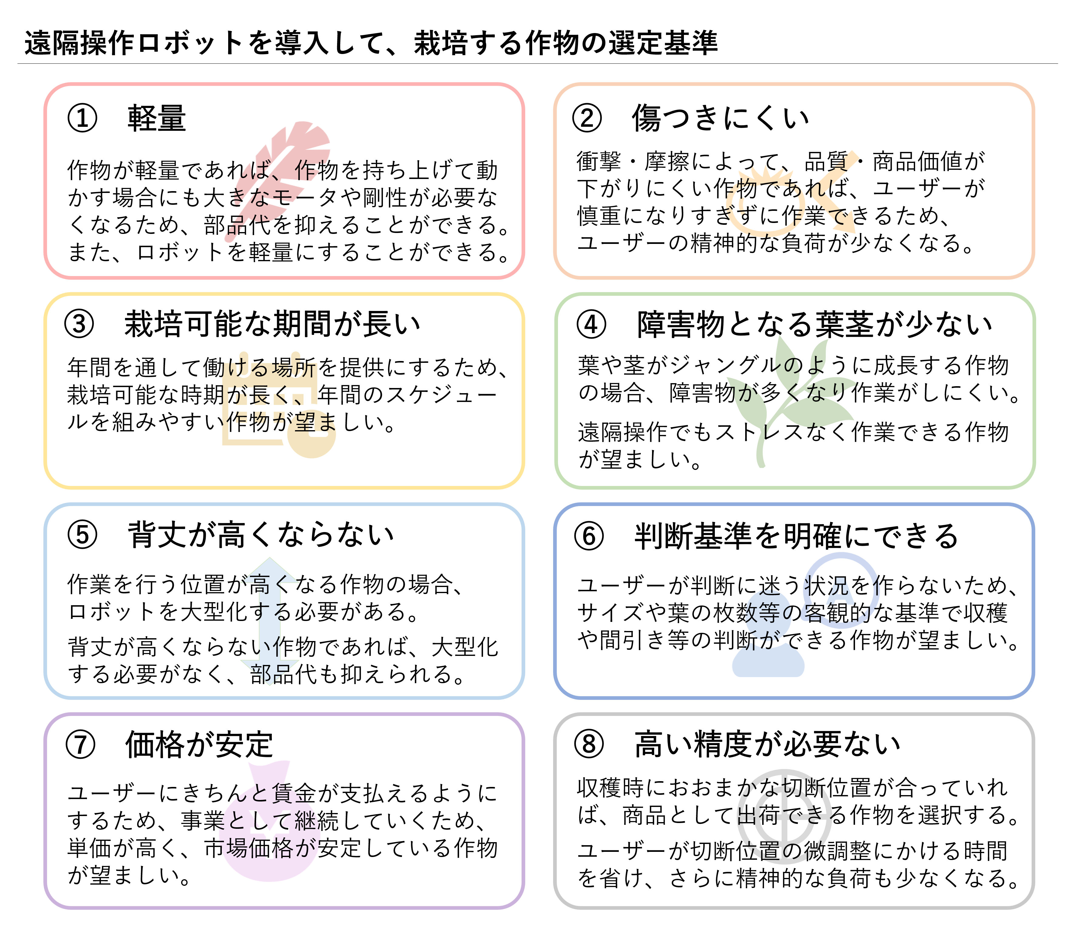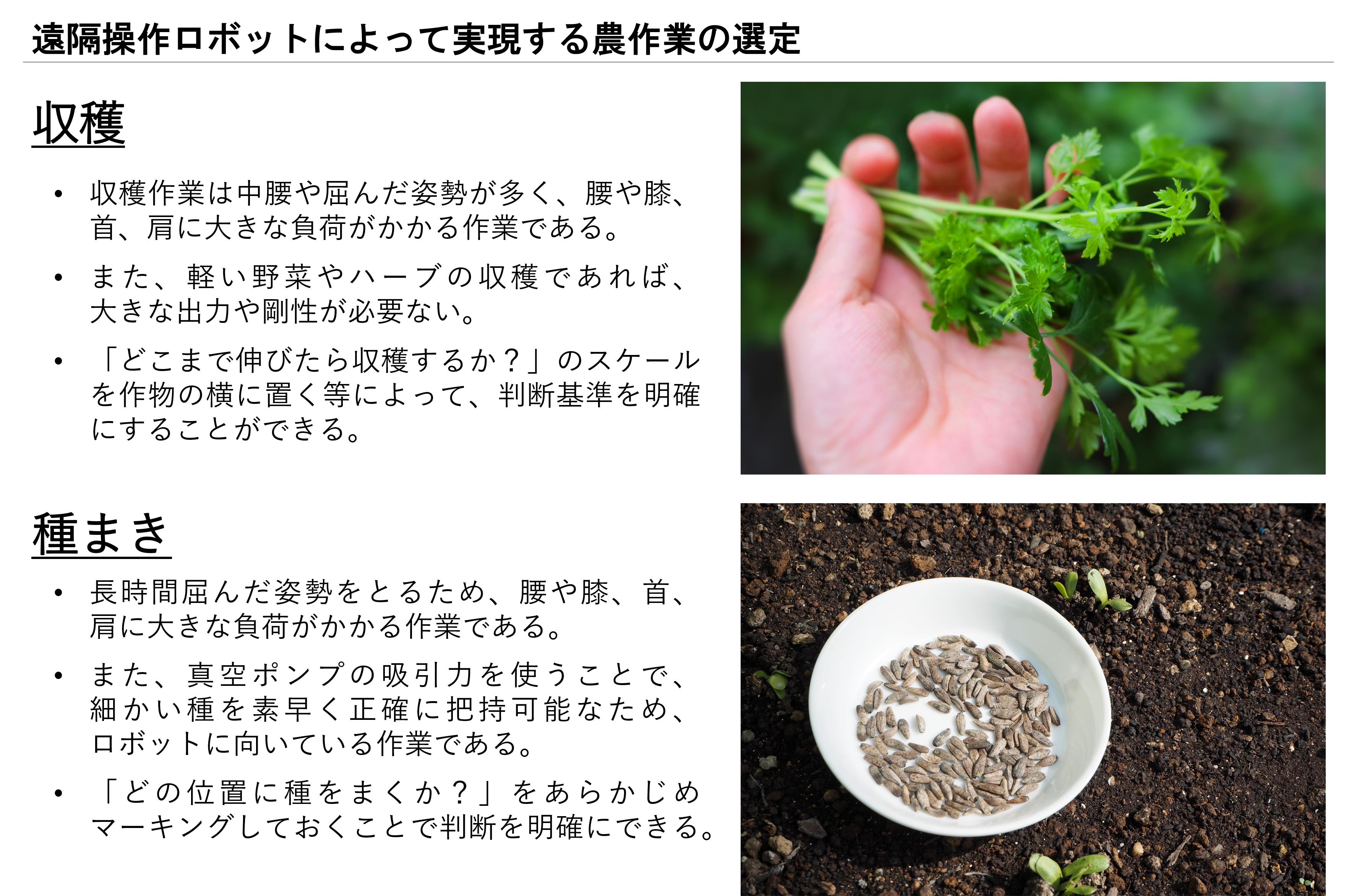 遠隔操作ロボットによって実現する農作業の選定基準は以下のように考えています。