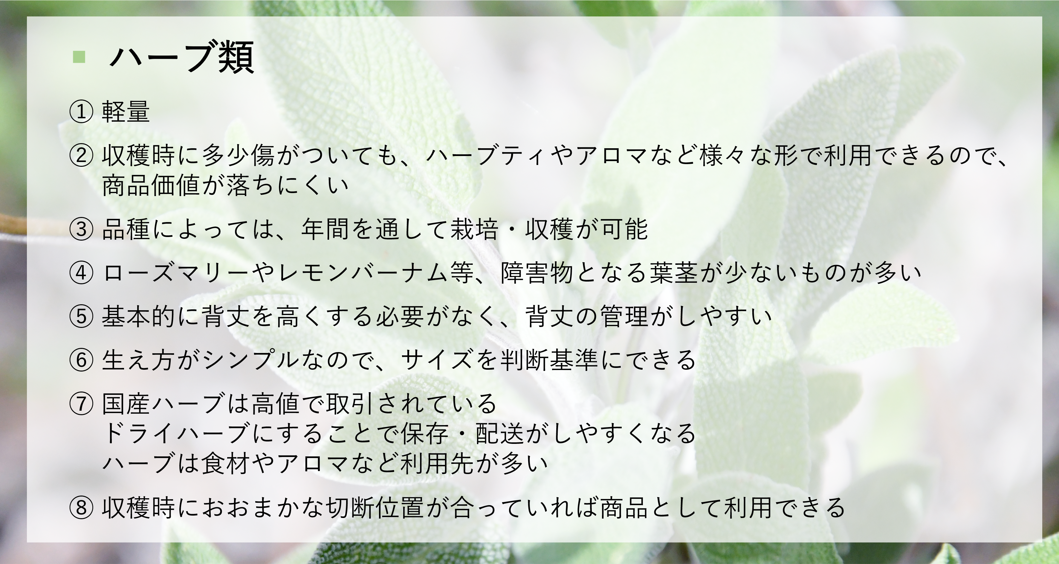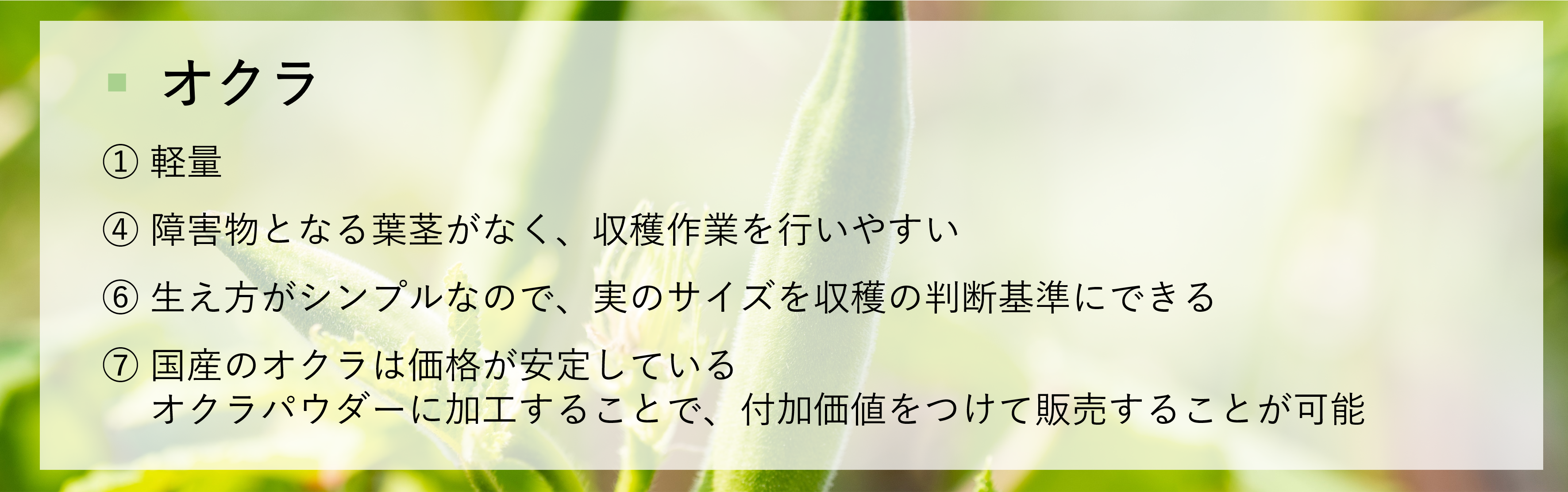 選定基準を考慮し、多くの条件を満たしている『ハーブ類』『葉ネギ・青ネギ』『オクラ』を栽培しようと考えています。
