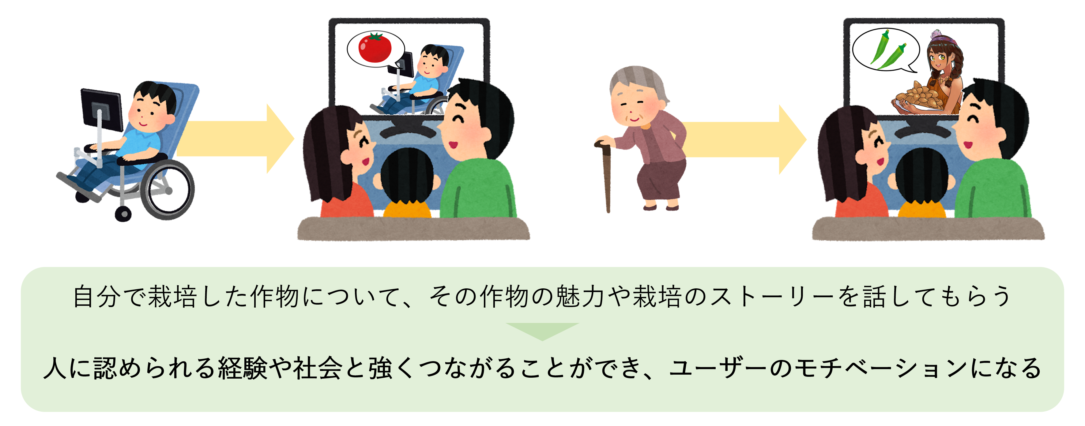加えて、障がい者・高齢者に自分が栽培した作物について、その作物の魅力や栽培のストーリーを説明し、生活者に販売する機会も作りたいと考えています。人に自分の頑張りを発表する機会も設けることで、人に仕事を評価してもらえたり、社会と強くつながる経験ができ、ユーザーのモチベーションアップにつながると考えています。