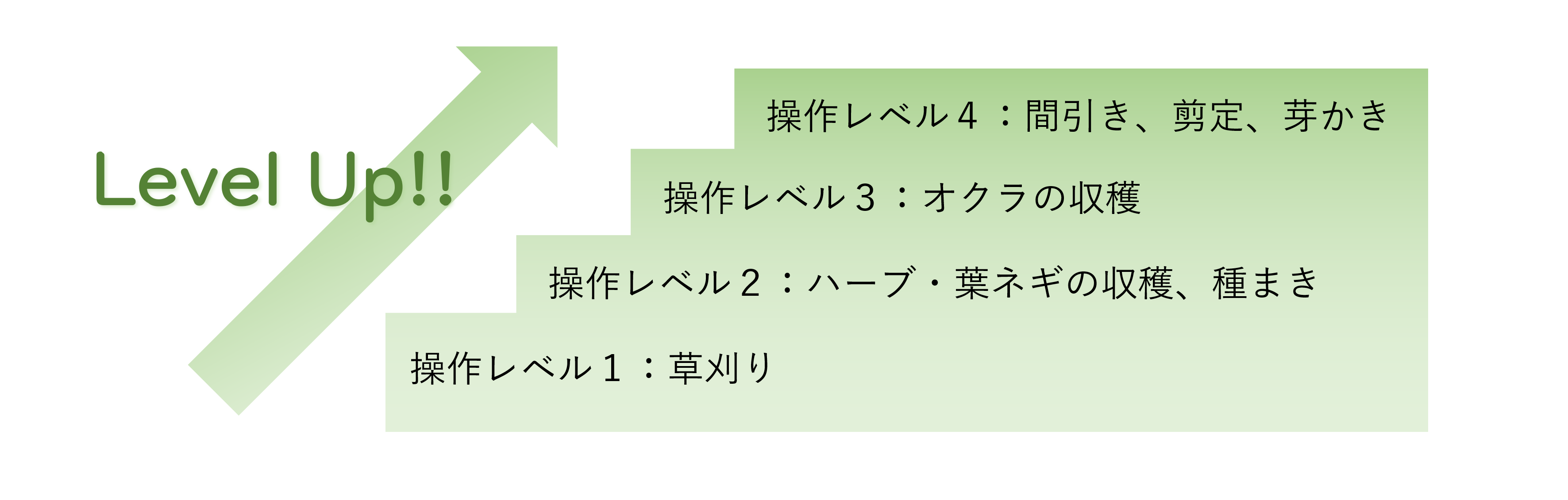 また、それぞれのユーザーが無理せずに行える操作レベルに応じて、農作業のマッチングを行いたいと考えています。そして、ユーザーの操作レベルが上がれば、そのレベルに応じて任せられる農作業を増やしていきます。できる作業が増えていくことで、ユーザーのモチベーションアップにもつながると考えています。