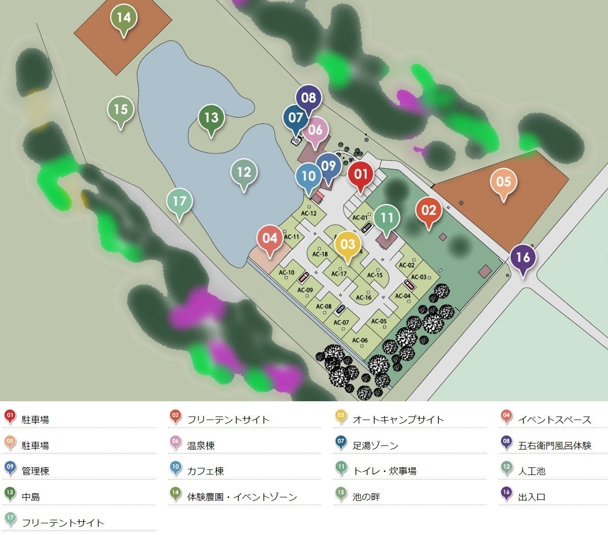 キャンプ施設は、指定された区画で車を乗り入れできるキャンプスペース となるオートキャンプサイトが18・車は駐車場に駐車して決められた区画の自由な場所にテントを設営するフリーテントサイトが約60(池のほとり含む)を造成、キャンプ場内のトイレ棟はウォシュレットで清潔感が有る内装をイメージしております。また、多目的トイレも整備しているので乳幼児・障がいのある方もご利用できるようにしております。[専用ホームページでのWEB予約優先利用となっております。]