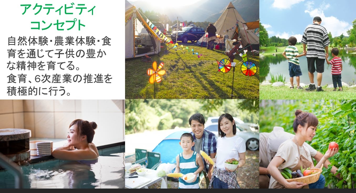 アクティビティは、メインターゲット を30〜40代のファミリー層としている背景と、地元の保育園・幼稚園・小学生へ貢献できるよう、施設内の体験農場・施設周辺の町有林を使い、 " 農業と自然に関わる教育・里山保全活動 " を実施する予定です。