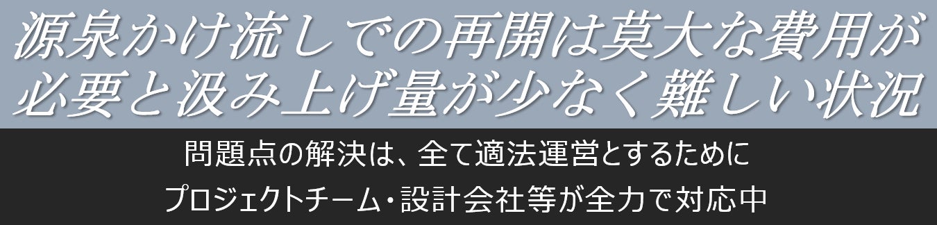 この問題点の解決の為には皆様からの御支援が必要な状況となっております。しかし、全ての問題を解決したとしても汲み上げ量の問題から毎日かけ流し温泉での提供は厳しい状況となっております。