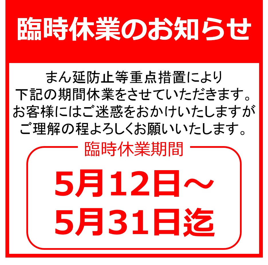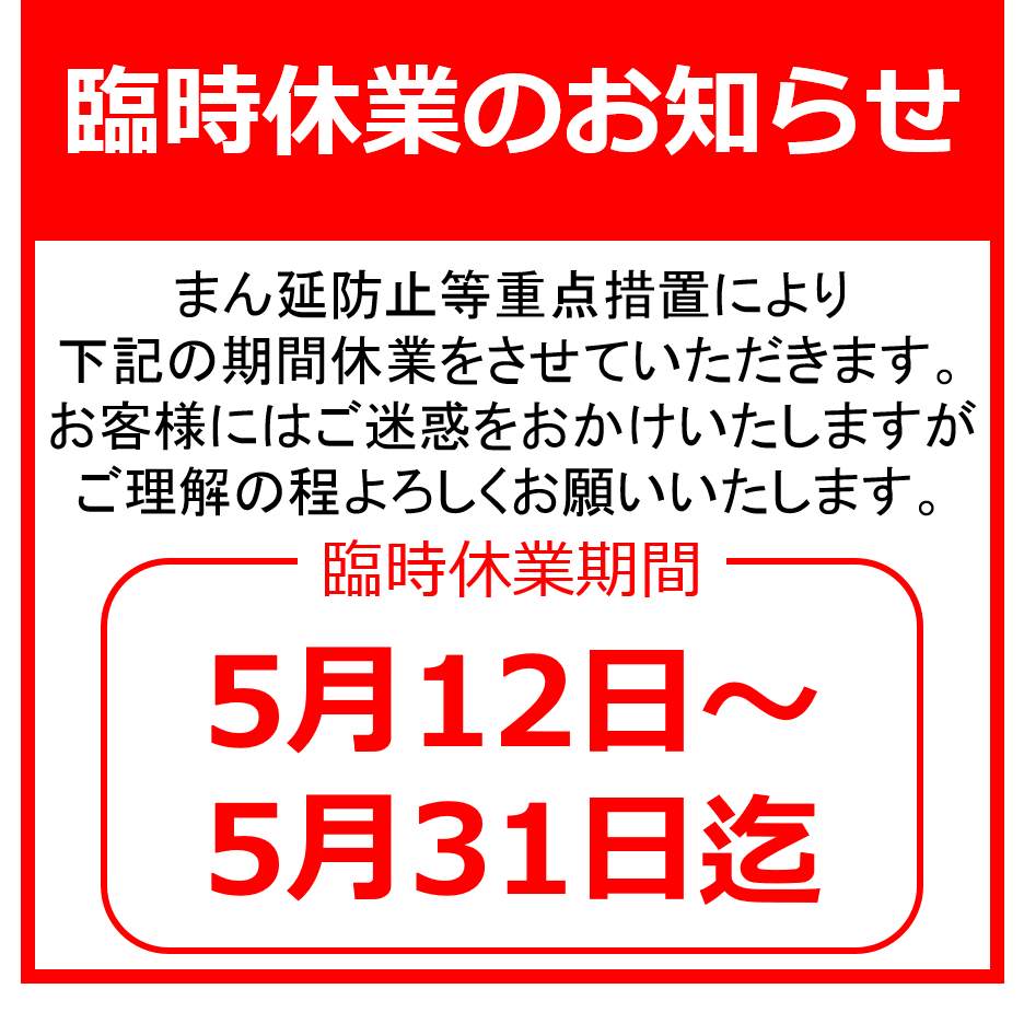2021/05/13 17:00まん延防止等重点措置に伴う要請に当店も協力することとなり、5/12~5/31の間、休業させて頂くこととなりました。スタッフも後ろ向きにならず、この間を利用し、改めて店内の清掃・消毒作業を入念に行い、新たな感染防止策を考えながら、再開後にお客様が安心してご利用頂ける取り組みを行っております。感染拡大の状況は日を追うごとに厳しくなっておりますが、1日も早い収束と皆様のご健康を祈念しております。 もっと見る