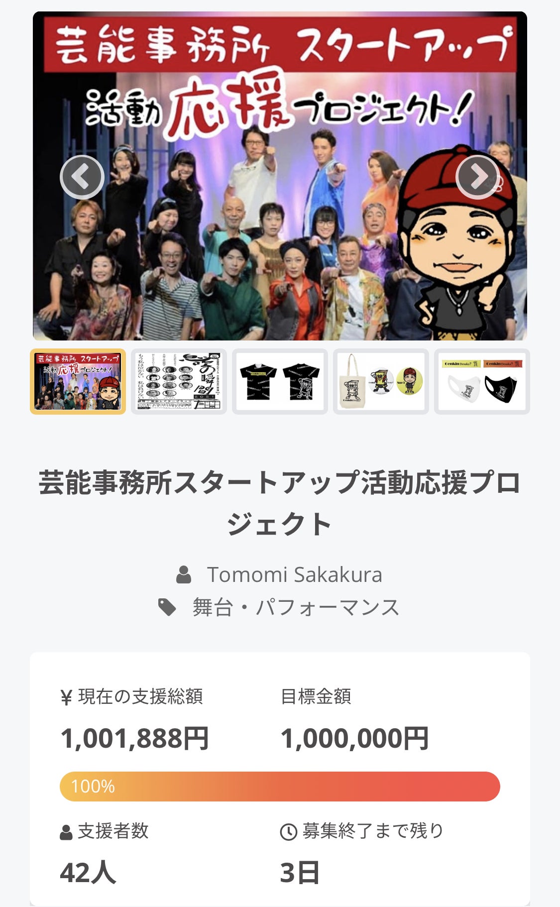 2021/06/09 07:44この度はご支援ご協力ありがとうございます!期限3日前にして、目標達成することができました。コロナの変異株が猛威をふるい、舞台の延期。それに伴って、リターンの一部が使えなくなるなどのトラブルも発生。コロナによる環境で苦しめられたから始めたクラウドファンディングでしたが、この企画さえもコロナの影響を受けてしまい一時は諦めかけた時もありましたが、皆様方の励ましが心を動かしご支援ご協力してくださった方々へ、成功させる事も恩返し、そう強く言い聞かせてきました。そして、何より皆様のご協力あっての達成です。本当に感謝しきれない気持ちでいっぱいです。今後は、事務所の活動を通して少しずつ皆様方に恩返しできたらと思います。ありがとうございました! もっと見る