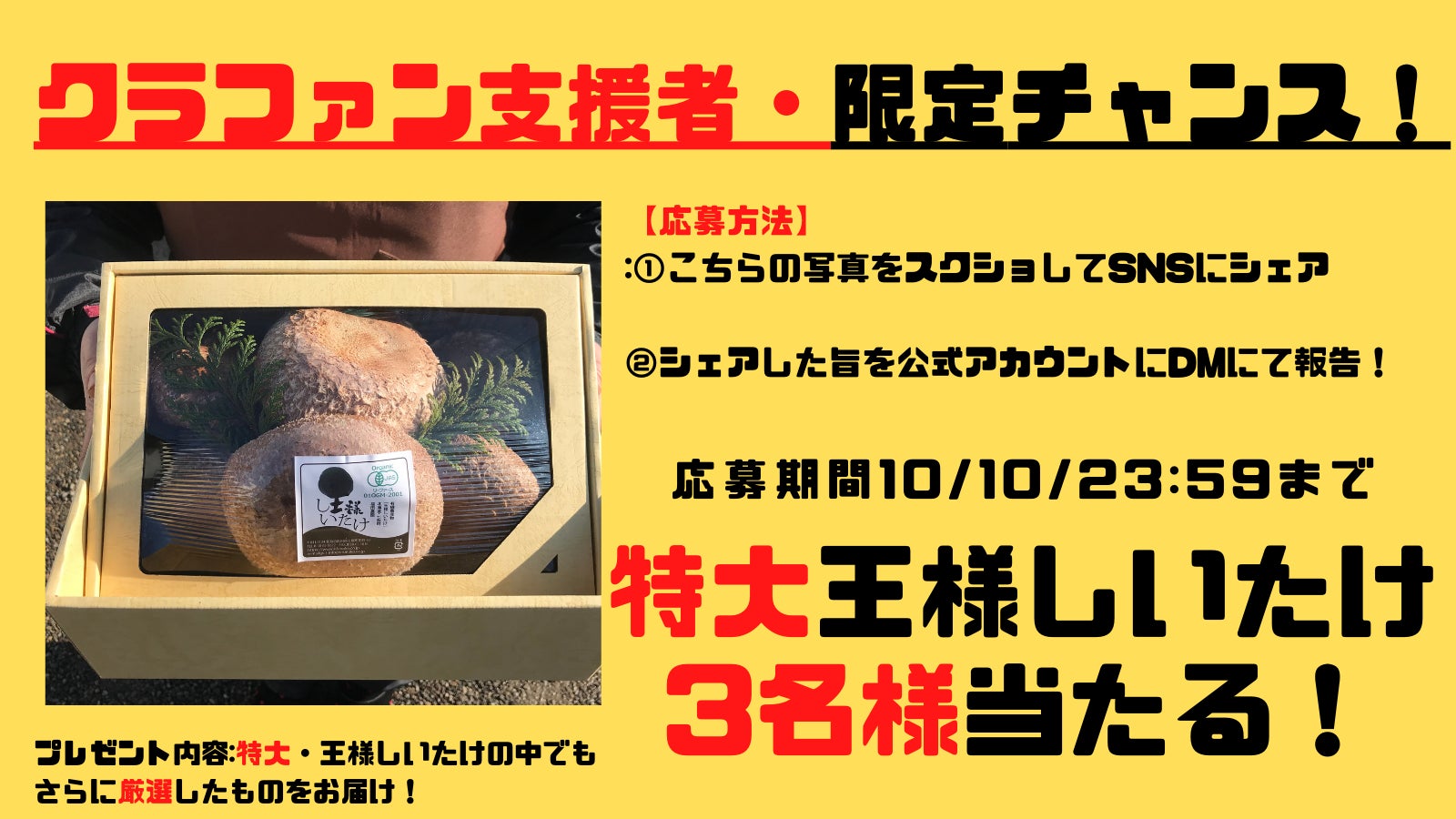 こちらは、クラファンの支援者の方に王様しいたけ広め隊として今回の支援を報告してもらおうという取り組みになります!以下の画像を皆様のお持ちのSNSでシェアをして頂ければ、投稿者の中から3名様に【限定・特大王様しいたけプレゼント致します!】